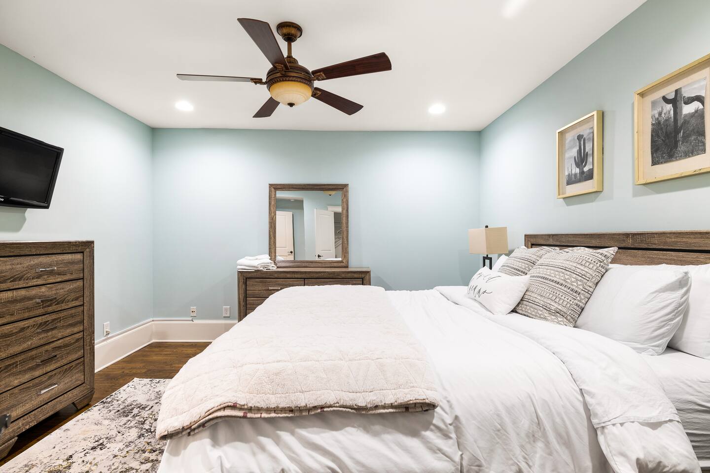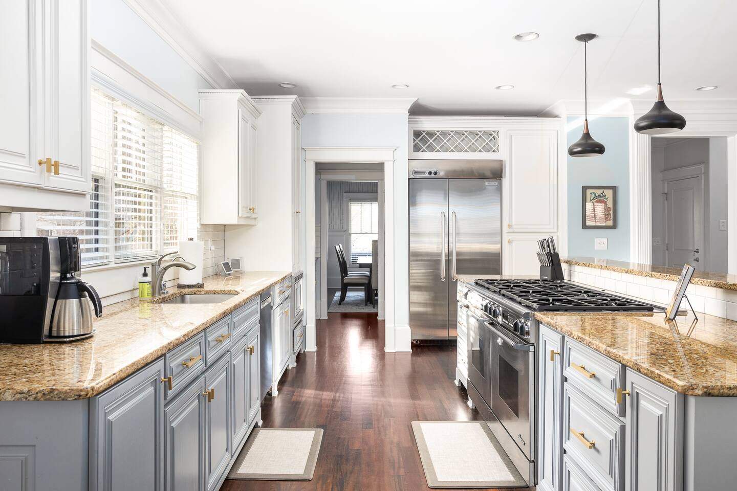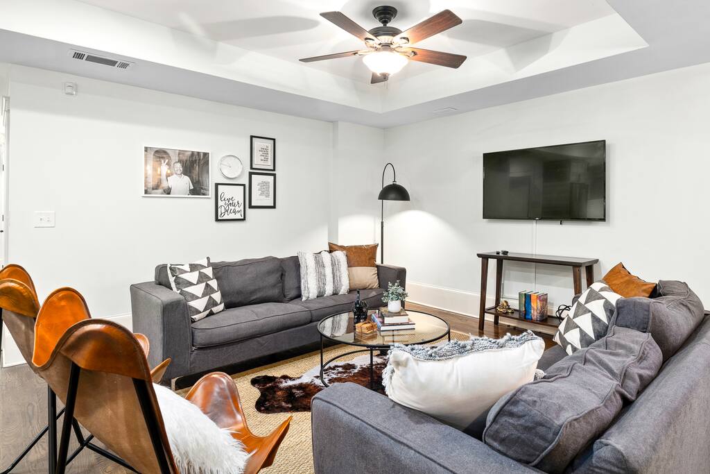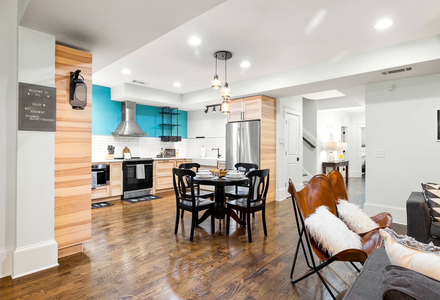 The star of this home is definitely the large, open concept kitchen, dining, and living space on the main level which is perfect for large families and groups who need a lot space. There is an even a wet bar with its own sink and beverage cooler in case you need the extra space for preparing drinks and food. The kitchen features two side-by-side professional grade ovens with 8 industrial burners. The formal dining room seats 8, the kitchen island bar has seating for up to 6, and the breakfast nook table seats 4. The upstairs includes all 4 bedrooms and three 3 very large bathrooms. The Master bathroom is what dreams are made of and features an oversized shower and soaking sub and enough mirrors and and sinks for an entire bridal party. If you need to get some work done the office provides plenty of privacy and lots of desk space and inspiration for your next big idea. The home also features a large front and back porch with outdoor fans and lots of seating options. It if gets chilly at night, we have a custom built outdoor fireplace to keep you warm and provide another cool and unique space to gather with your friends and family in this one of a kind space in the heart of Atlanta. This listing also includes a surprisingly spacious 2/1 basement apartment if your group needs lots of beds and bedrooms but also wants just the right amount of space.