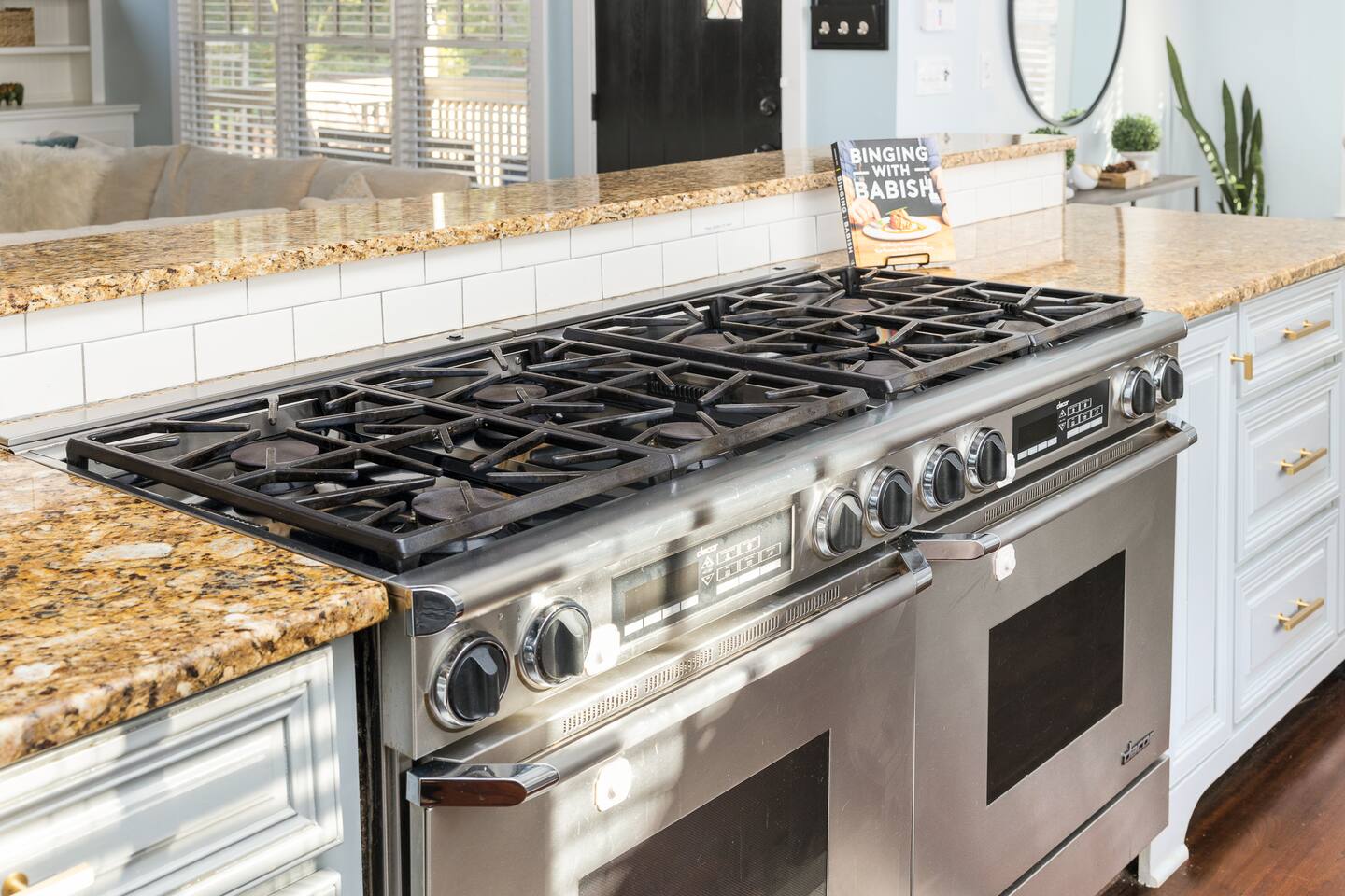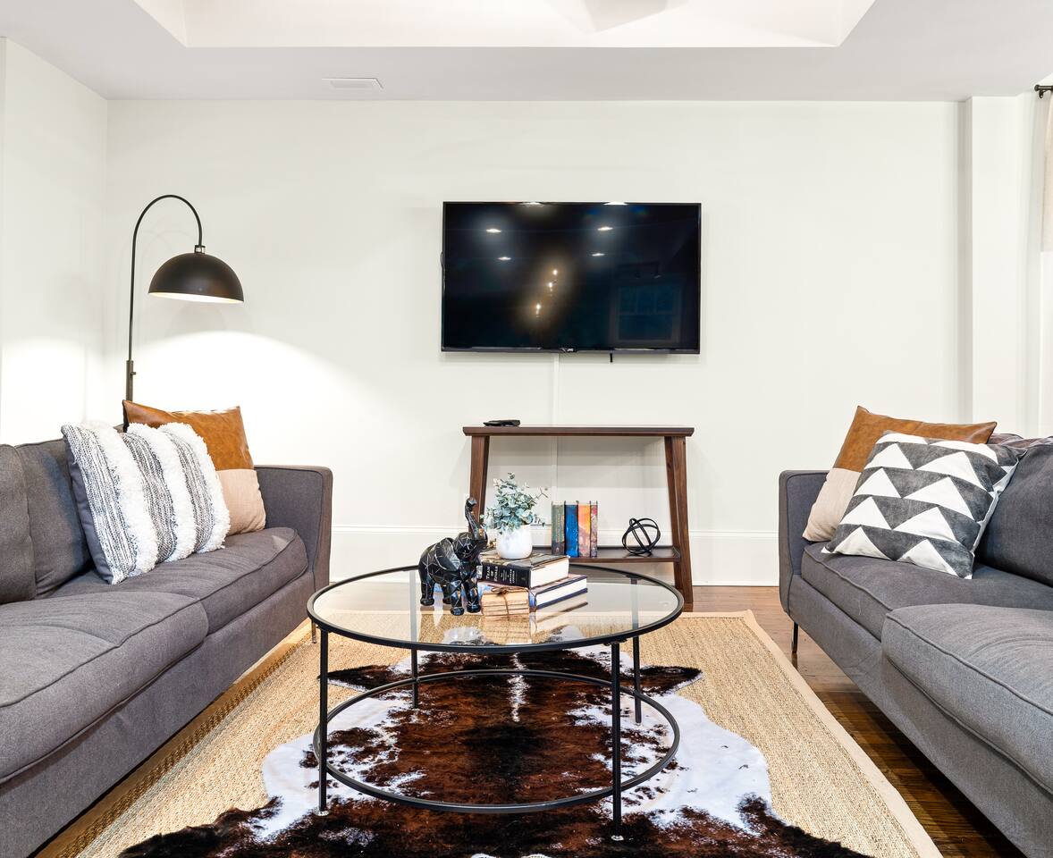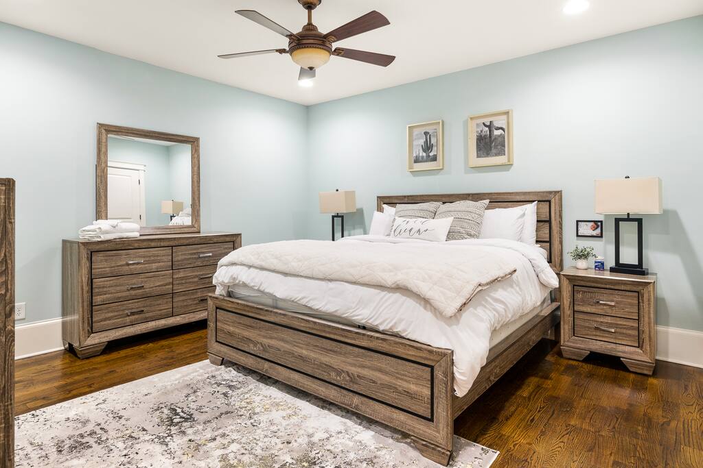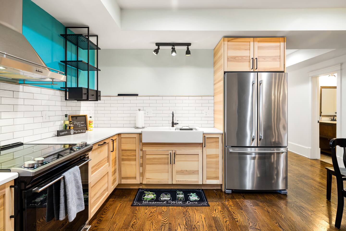 The star of this home is definitely the large, open concept kitchen, dining, and living space on the main level which is perfect for large families and groups who need a lot space. There is an even a wet bar with its own sink and beverage cooler in case you need the extra space for preparing drinks and food. The kitchen features two side-by-side professional grade ovens with 8 industrial burners. The formal dining room seats 8, the kitchen island bar has seating for up to 6, and the breakfast nook table seats 4. The upstairs includes all 4 bedrooms and three 3 very large bathrooms. The Master bathroom is what dreams are made of and features an oversized shower and soaking sub and enough mirrors and and sinks for an entire bridal party. If you need to get some work done the office provides plenty of privacy and lots of desk space and inspiration for your next big idea. The home also features a large front and back porch with outdoor fans and lots of seating options. It if gets chilly at night, we have a custom built outdoor fireplace to keep you warm and provide another cool and unique space to gather with your friends and family in this one of a kind space in the heart of Atlanta. This listing also includes a surprisingly spacious 2/1 basement apartment if your group needs lots of beds and bedrooms but also wants just the right amount of space.
