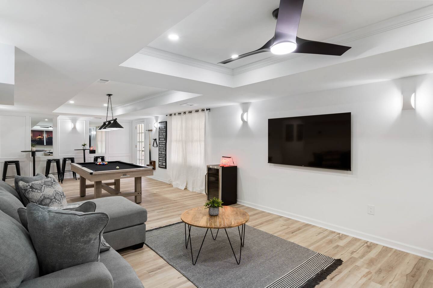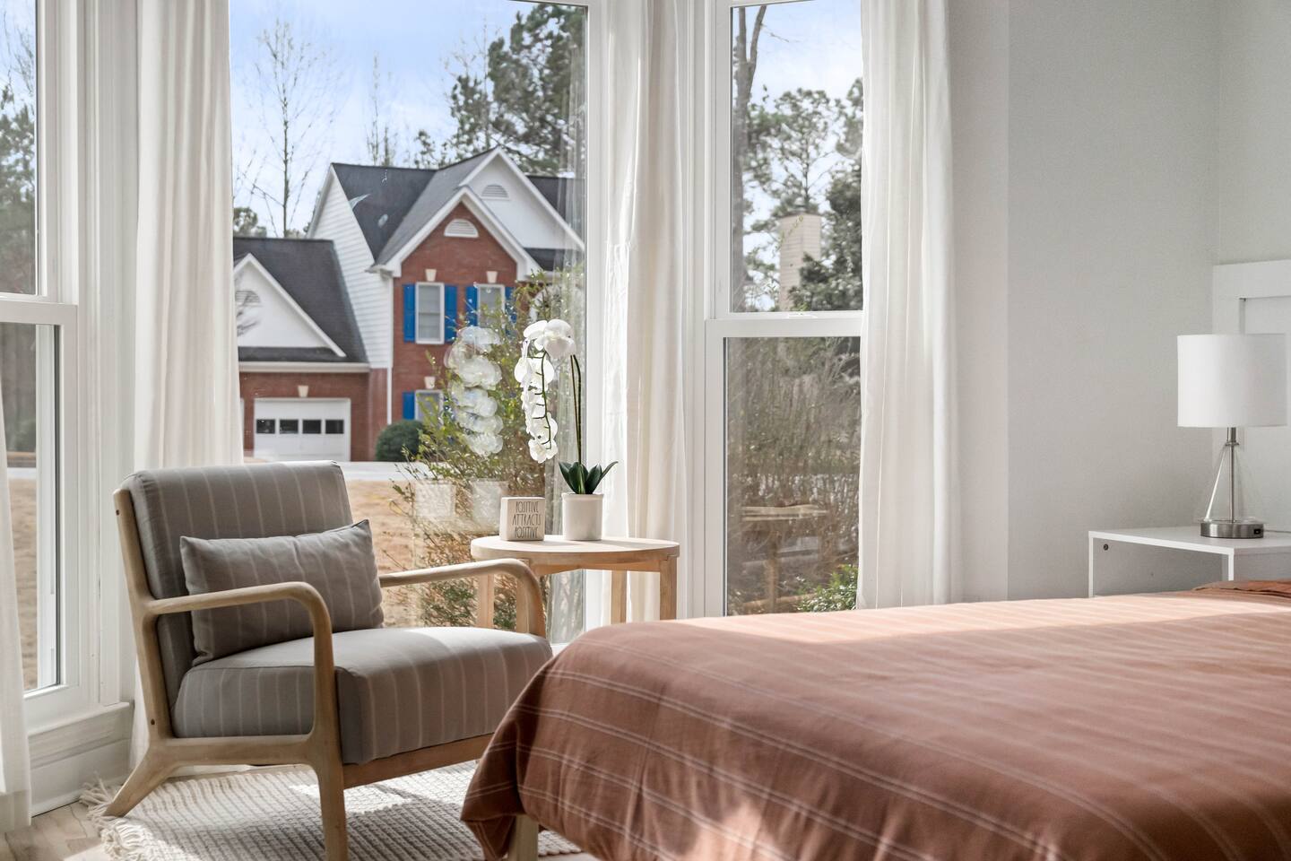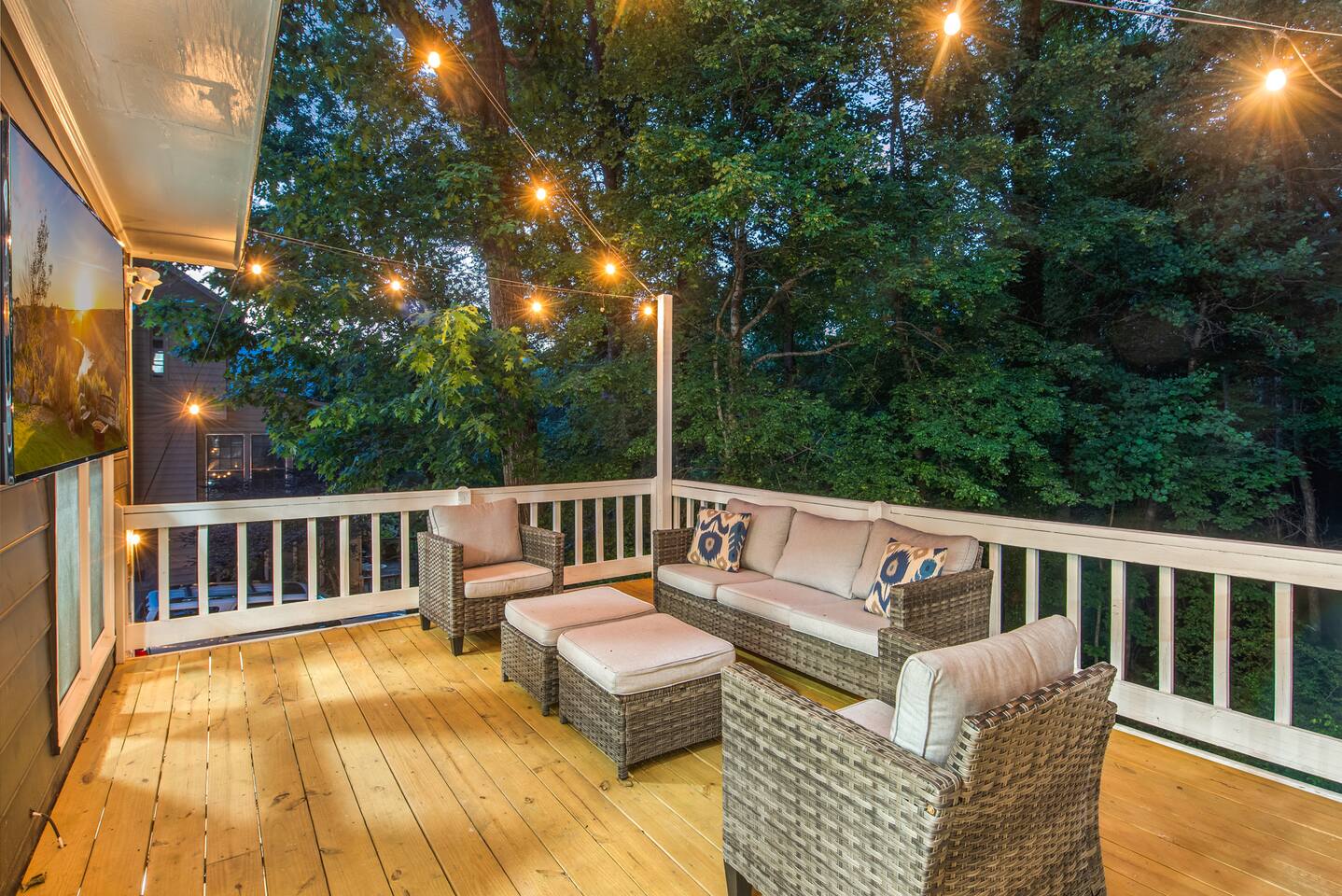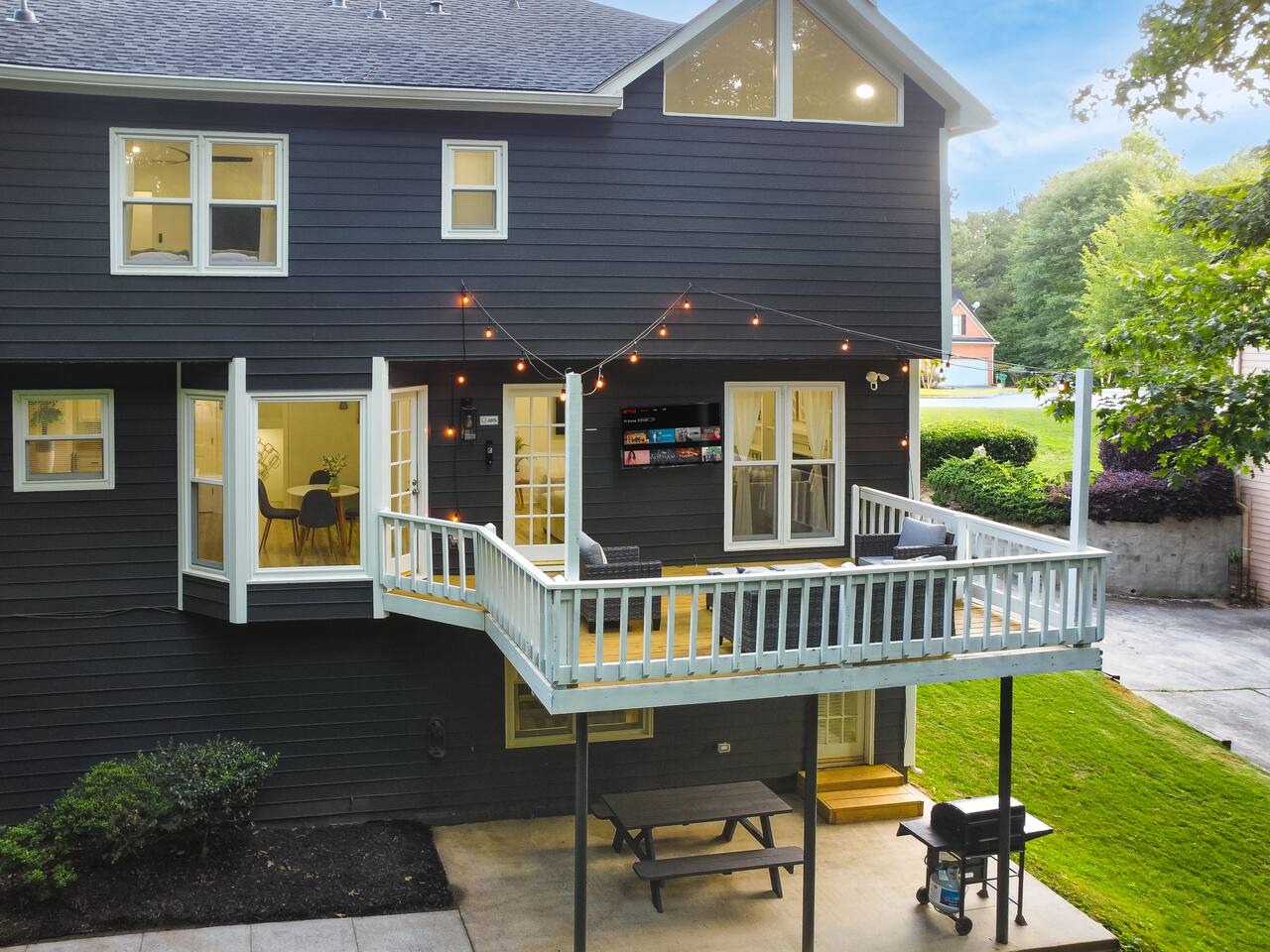 Our home is a spacious 6-bedroom, 3.5-bathroom sanctuary—nearly 5,000 square feet of living space—perfect for families, groups of friends, or anyone who wants more room to breathe. Completely renovated in spring 2023, it blends modern comfort with thoughtful design. Tucked into a peaceful neighborhood just 20 minutes from downtown Atlanta, it gives you easy access to the city while feeling like a calm retreat. As you step in, the main two levels host four comfortable bedrooms and 2.5 bathrooms, along with a large dining room and an open kitchen built for making meals together. The basement expands the living space further: it includes a sixth bedroom and a full bathroom, and the heart of the lower level is a game room complete with a pool table and a wet bar—ideal for friendly competition, casual evenings, or simply lounging with drinks and conversation. Each of the six bedrooms is outfitted with a plush bed and its own 55-inch 4K smart TV, so everyone can unwind with a show or movie after a busy day. The master suite feels like its own mini getaway: cathedral vaulted ceilings, a huge walk-in shower, and a generous soaking tub let you soak away the day in comfort. The home’s living room centers around a 75-inch TV, inviting movie nights or big-screen gatherings. One of the highlights is our outdoor entertainment space. Step onto the back deck to find seating for relaxing or dining outside. A 55-inch 4K TV is mounted for outdoor movie or game viewing under the sky, making it an excellent spot for al fresco evenings. An additional patio ensures there’s room to stretch out, enjoy the air, or sip your morning coffee in the shade. Our kitchen is fully stocked with everything home cooks might need—pots, pans, utensils, seasonings, and space to prepare group meals. The dining room seats eight comfortably, and the overall layout supports socializing without cramping movement. Whether your group wants to come together or spread out, there are places to gather and places to retreat. When you stay here, you get full access to the house: all six bedrooms, all 3.5 bathrooms, both living levels plus the basement game room, and all outdoor areas. We designed this home so guests can feel both at ease and inspired—whether your plan is full days out in Atlanta, time together indoors, or both. Let this house be your base for laughter, rest, and shared memories.