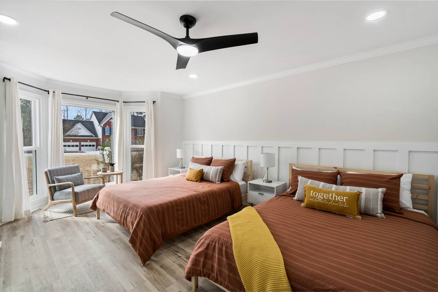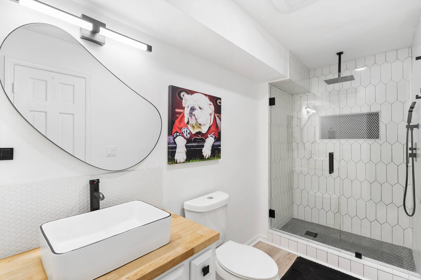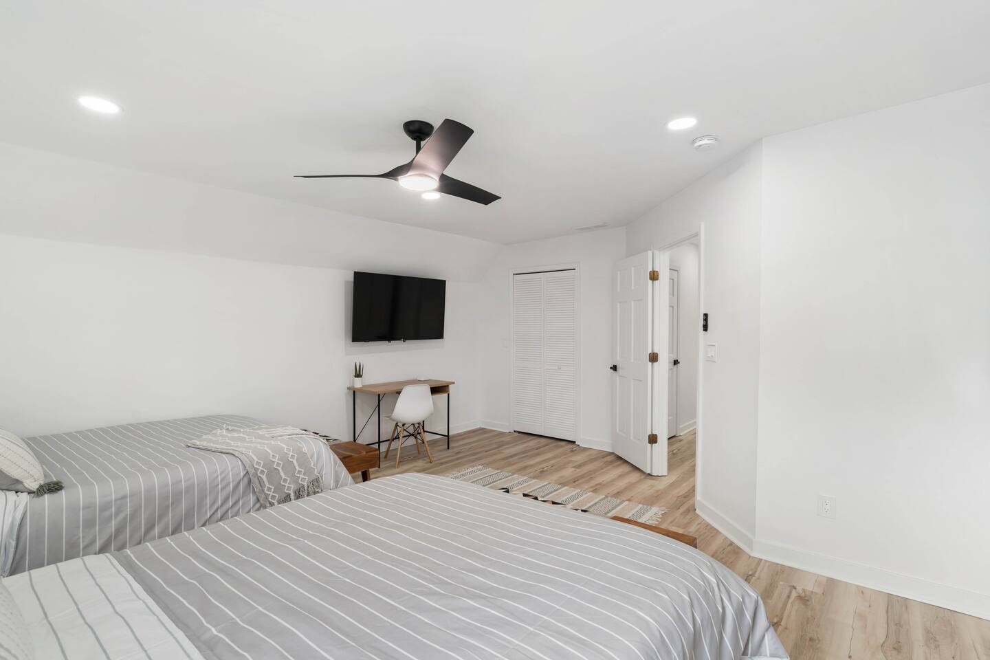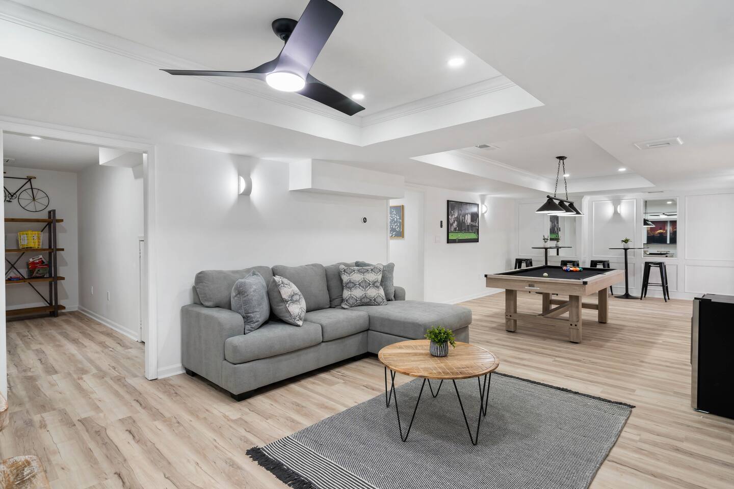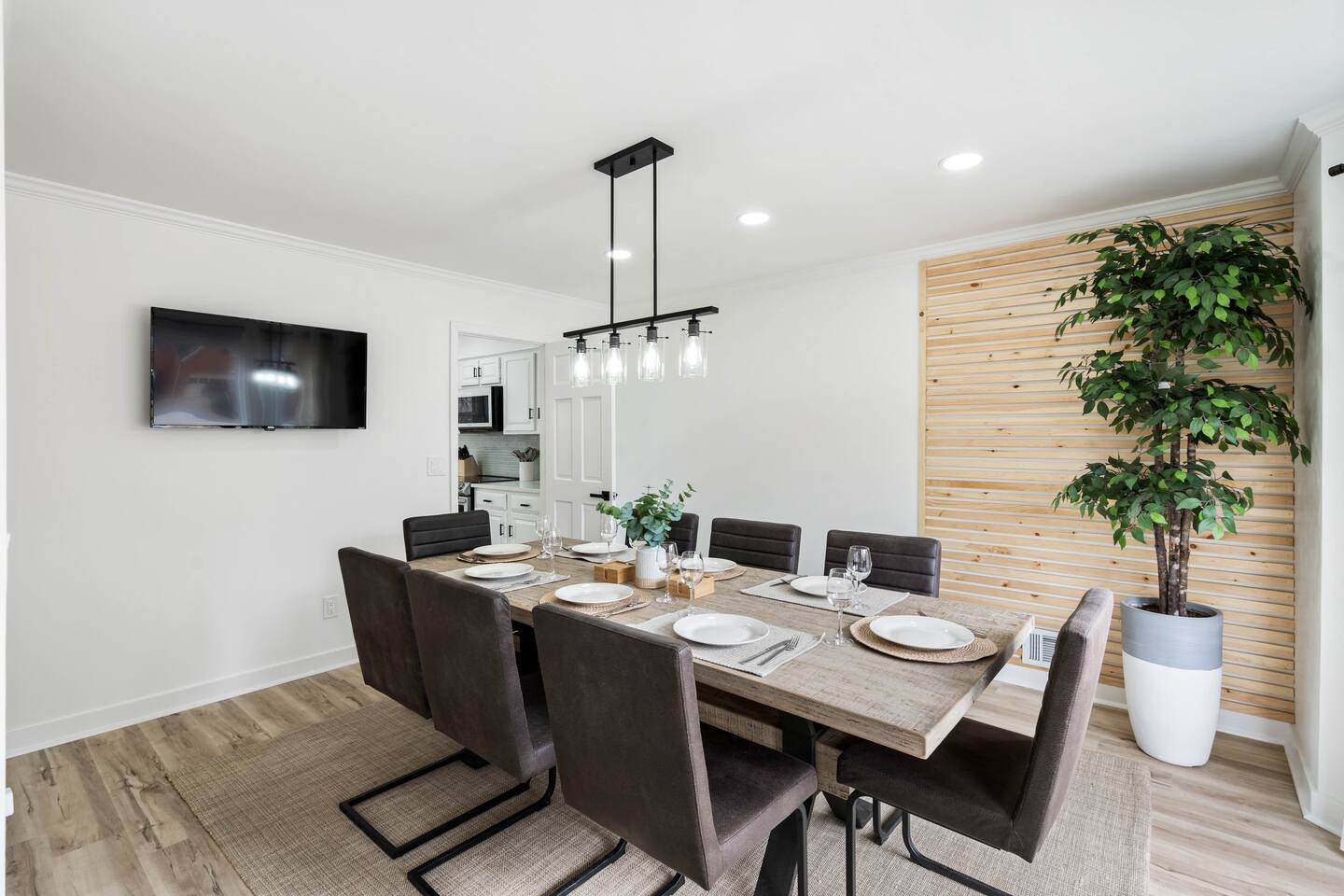 Our home is a spacious 6-bedroom, 3.5-bathroom sanctuary—nearly 5,000 square feet of living space—perfect for families, groups of friends, or anyone who wants more room to breathe. Completely renovated in spring 2023, it blends modern comfort with thoughtful design. Tucked into a peaceful neighborhood just 20 minutes from downtown Atlanta, it gives you easy access to the city while feeling like a calm retreat. As you step in, the main two levels host four comfortable bedrooms and 2.5 bathrooms, along with a large dining room and an open kitchen built for making meals together. The basement expands the living space further: it includes a sixth bedroom and a full bathroom, and the heart of the lower level is a game room complete with a pool table and a wet bar—ideal for friendly competition, casual evenings, or simply lounging with drinks and conversation. Each of the six bedrooms is outfitted with a plush bed and its own 55-inch 4K smart TV, so everyone can unwind with a show or movie after a busy day. The master suite feels like its own mini getaway: cathedral vaulted ceilings, a huge walk-in shower, and a generous soaking tub let you soak away the day in comfort. The home’s living room centers around a 75-inch TV, inviting movie nights or big-screen gatherings. One of the highlights is our outdoor entertainment space. Step onto the back deck to find seating for relaxing or dining outside. A 55-inch 4K TV is mounted for outdoor movie or game viewing under the sky, making it an excellent spot for al fresco evenings. An additional patio ensures there’s room to stretch out, enjoy the air, or sip your morning coffee in the shade. Our kitchen is fully stocked with everything home cooks might need—pots, pans, utensils, seasonings, and space to prepare group meals. The dining room seats eight comfortably, and the overall layout supports socializing without cramping movement. Whether your group wants to come together or spread out, there are places to gather and places to retreat. When you stay here, you get full access to the house: all six bedrooms, all 3.5 bathrooms, both living levels plus the basement game room, and all outdoor areas. We designed this home so guests can feel both at ease and inspired—whether your plan is full days out in Atlanta, time together indoors, or both. Let this house be your base for laughter, rest, and shared memories.