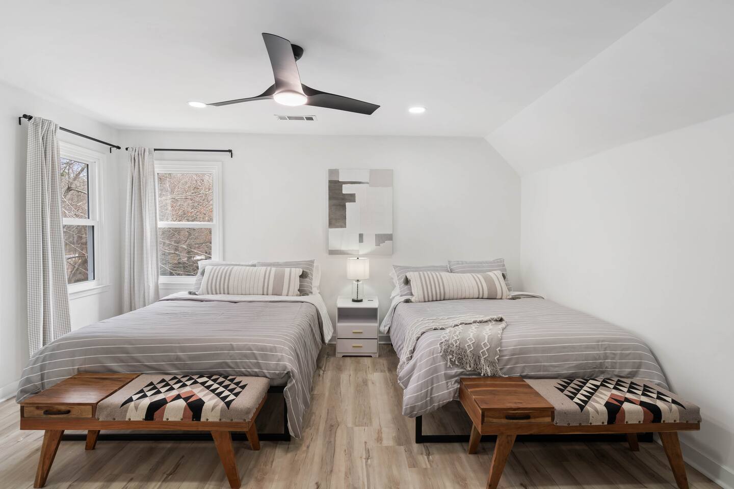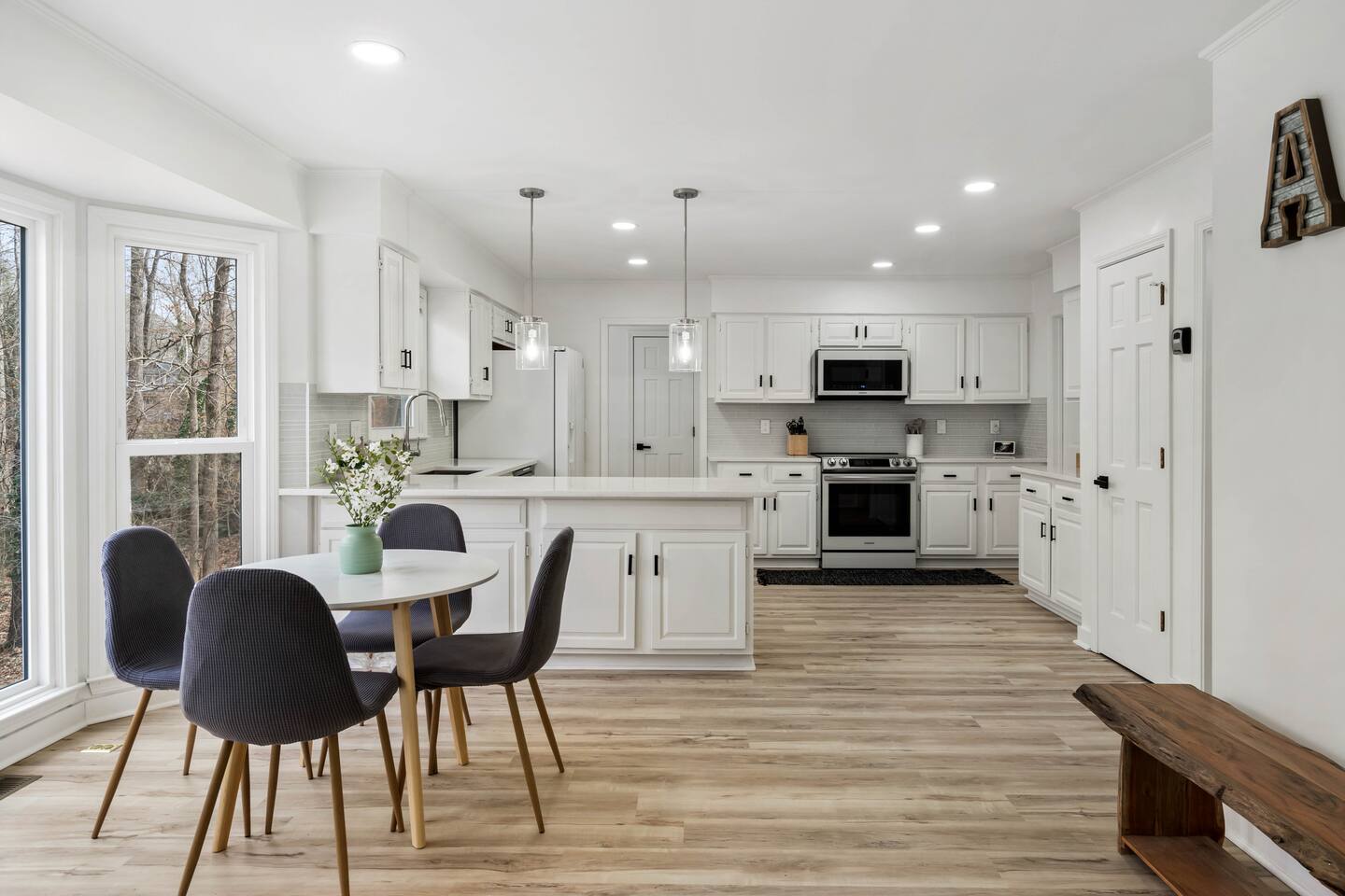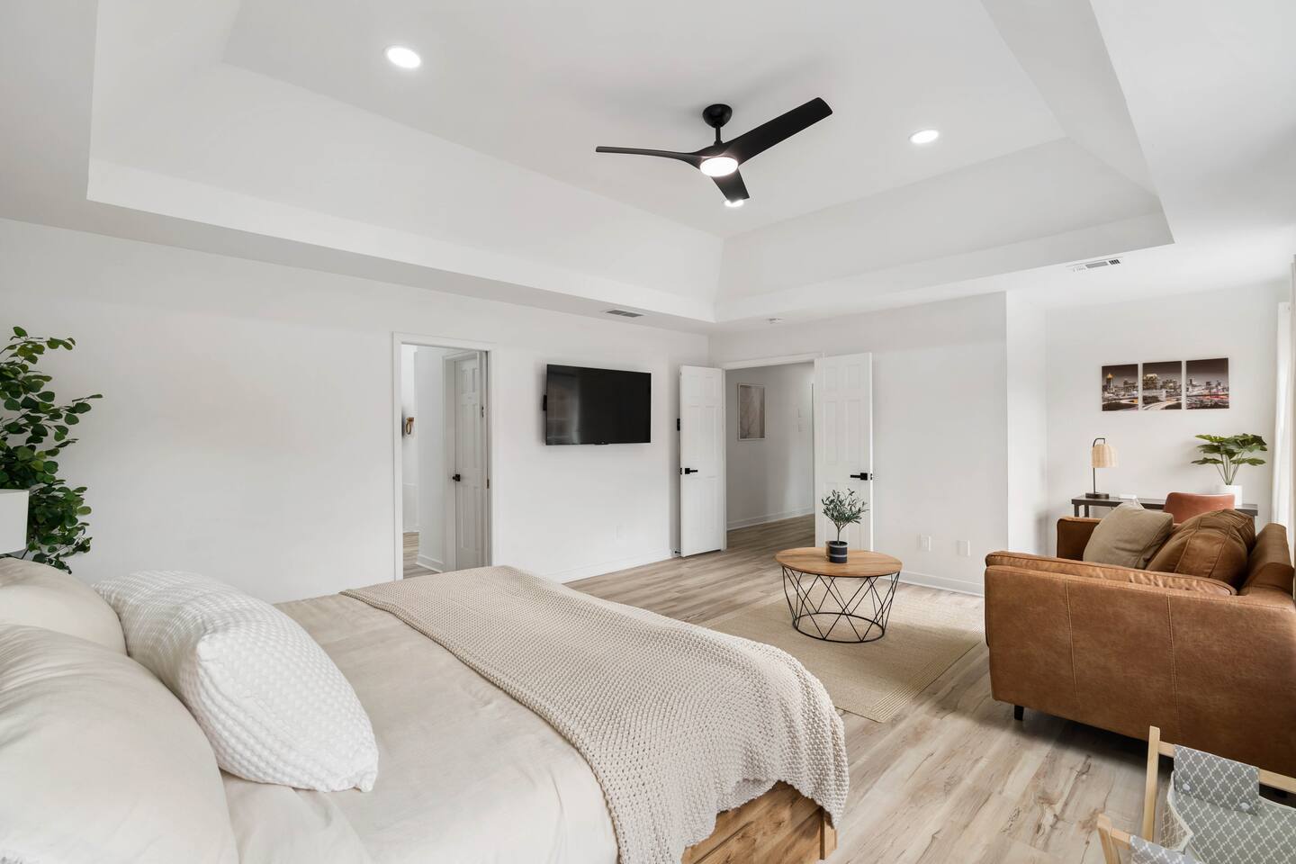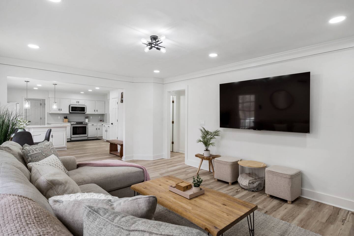 Our home is a spacious 6-bedroom, 3.5-bathroom sanctuary—nearly 5,000 square feet of living space—perfect for families, groups of friends, or anyone who wants more room to breathe. Completely renovated in spring 2023, it blends modern comfort with thoughtful design. Tucked into a peaceful neighborhood just 20 minutes from downtown Atlanta, it gives you easy access to the city while feeling like a calm retreat. As you step in, the main two levels host four comfortable bedrooms and 2.5 bathrooms, along with a large dining room and an open kitchen built for making meals together. The basement expands the living space further: it includes a sixth bedroom and a full bathroom, and the heart of the lower level is a game room complete with a pool table and a wet bar—ideal for friendly competition, casual evenings, or simply lounging with drinks and conversation. Each of the six bedrooms is outfitted with a plush bed and its own 55-inch 4K smart TV, so everyone can unwind with a show or movie after a busy day. The master suite feels like its own mini getaway: cathedral vaulted ceilings, a huge walk-in shower, and a generous soaking tub let you soak away the day in comfort. The home’s living room centers around a 75-inch TV, inviting movie nights or big-screen gatherings. One of the highlights is our outdoor entertainment space. Step onto the back deck to find seating for relaxing or dining outside. A 55-inch 4K TV is mounted for outdoor movie or game viewing under the sky, making it an excellent spot for al fresco evenings. An additional patio ensures there’s room to stretch out, enjoy the air, or sip your morning coffee in the shade. Our kitchen is fully stocked with everything home cooks might need—pots, pans, utensils, seasonings, and space to prepare group meals. The dining room seats eight comfortably, and the overall layout supports socializing without cramping movement. Whether your group wants to come together or spread out, there are places to gather and places to retreat. When you stay here, you get full access to the house: all six bedrooms, all 3.5 bathrooms, both living levels plus the basement game room, and all outdoor areas. We designed this home so guests can feel both at ease and inspired—whether your plan is full days out in Atlanta, time together indoors, or both. Let this house be your base for laughter, rest, and shared memories.