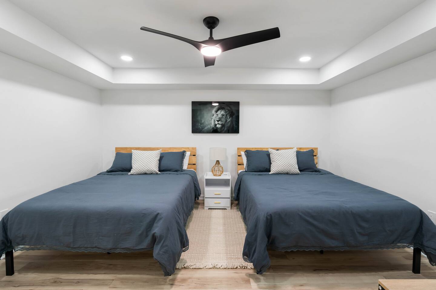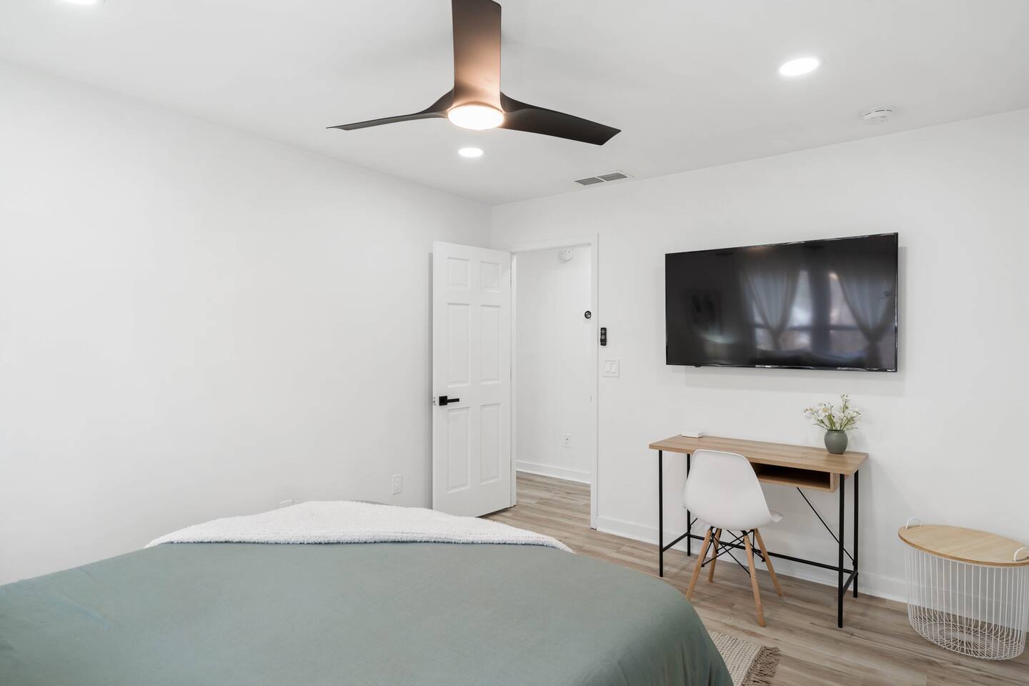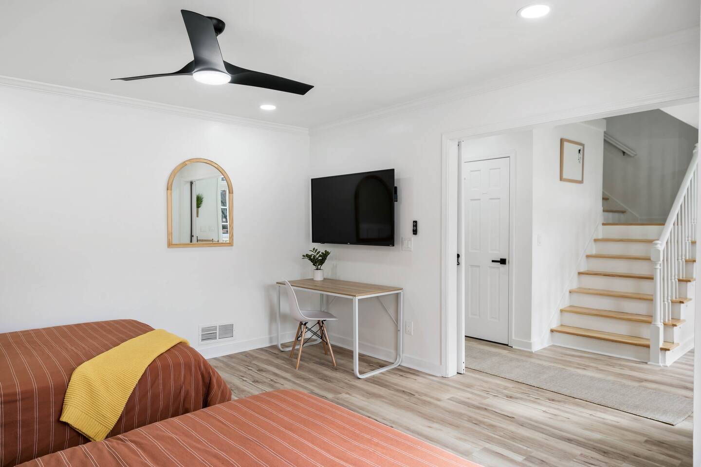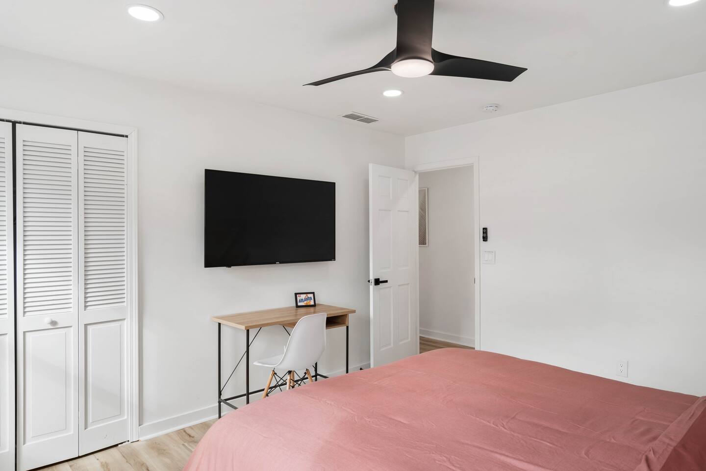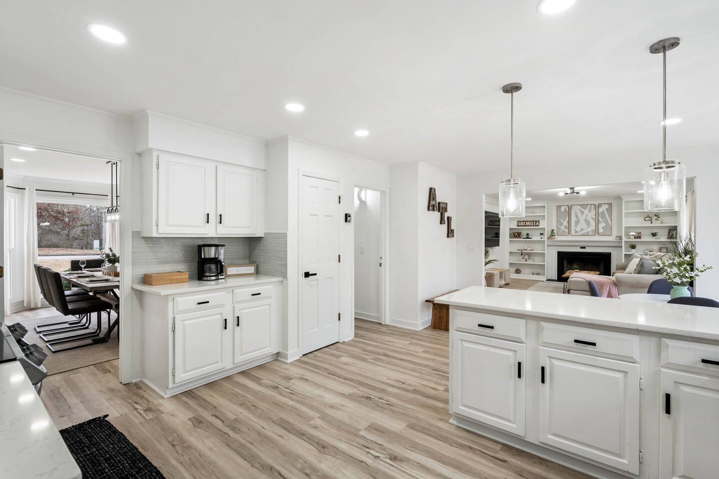 Our home is a spacious 6-bedroom, 3.5-bathroom sanctuary—nearly 5,000 square feet of living space—perfect for families, groups of friends, or anyone who wants more room to breathe. Completely renovated in spring 2023, it blends modern comfort with thoughtful design. Tucked into a peaceful neighborhood just 20 minutes from downtown Atlanta, it gives you easy access to the city while feeling like a calm retreat. As you step in, the main two levels host four comfortable bedrooms and 2.5 bathrooms, along with a large dining room and an open kitchen built for making meals together. The basement expands the living space further: it includes a sixth bedroom and a full bathroom, and the heart of the lower level is a game room complete with a pool table and a wet bar—ideal for friendly competition, casual evenings, or simply lounging with drinks and conversation. Each of the six bedrooms is outfitted with a plush bed and its own 55-inch 4K smart TV, so everyone can unwind with a show or movie after a busy day. The master suite feels like its own mini getaway: cathedral vaulted ceilings, a huge walk-in shower, and a generous soaking tub let you soak away the day in comfort. The home’s living room centers around a 75-inch TV, inviting movie nights or big-screen gatherings. One of the highlights is our outdoor entertainment space. Step onto the back deck to find seating for relaxing or dining outside. A 55-inch 4K TV is mounted for outdoor movie or game viewing under the sky, making it an excellent spot for al fresco evenings. An additional patio ensures there’s room to stretch out, enjoy the air, or sip your morning coffee in the shade. Our kitchen is fully stocked with everything home cooks might need—pots, pans, utensils, seasonings, and space to prepare group meals. The dining room seats eight comfortably, and the overall layout supports socializing without cramping movement. Whether your group wants to come together or spread out, there are places to gather and places to retreat. When you stay here, you get full access to the house: all six bedrooms, all 3.5 bathrooms, both living levels plus the basement game room, and all outdoor areas. We designed this home so guests can feel both at ease and inspired—whether your plan is full days out in Atlanta, time together indoors, or both. Let this house be your base for laughter, rest, and shared memories.