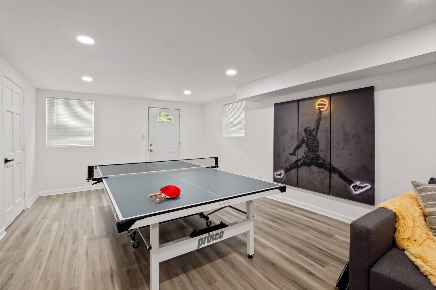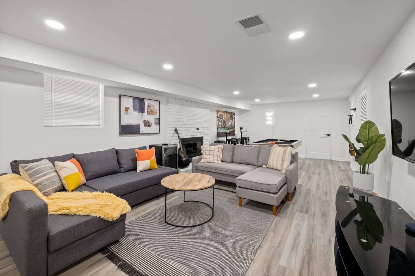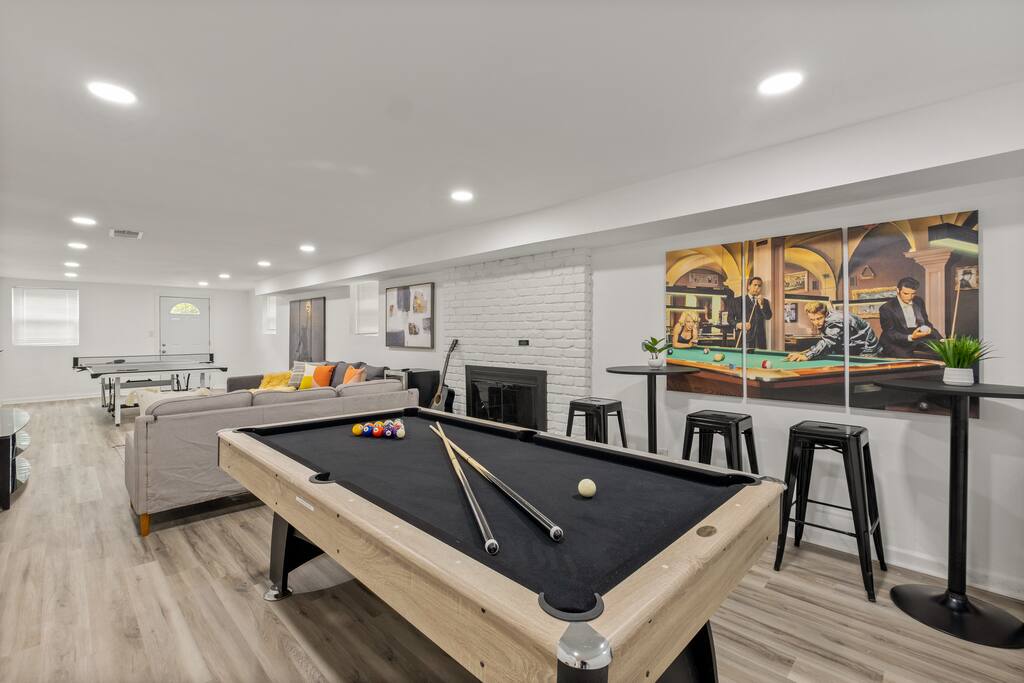 Our beautiful 6-bedroom 4-bathroom home is very roomy (4400 Square Feet!) and great for big families and large, responsible groups of friends. The main 2 levels of the home include 4 bedrooms, 3 bathrooms, 2 living rooms, and a very spacious dining room and kitchen. The basement level of the home includes 2 bedrooms, 2 living rooms, and 1 bathroom. The living room in the basement is gigantic and has a pool table, ping pong table, and old school arcade game Cabinet.