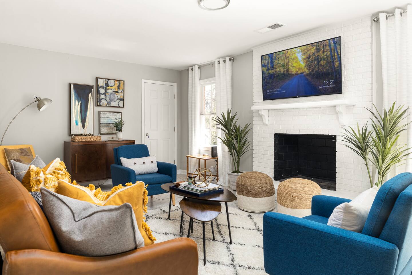 The front door opens into a roomy living/kitchen/dining area which will become the main hang-out area. The living room has lots of seating and a 55 inch smart TV with Roku. The kitchen includes lots of cooking gear and a nice array of spices & oil. A coffee maker, filters, and coffee are provided. The living room has a large vinyl collection and a record player. There are enough plates, glasses, bowls, and silverware to serve 6. There are four bedrooms and two bathrooms located in the home. Outdoor Space: The patio on the back of the house has two picnic tables with lots of seating and string lights to use at night. We suggest enjoying a meal or beverage outside since the weather in Atlanta is pretty nice most of the year. Feel free to bring a croquet set or a ball to throw around. Parking: There is a driveway with 6 parking spots that you may use at all times. Additional cars will have no trouble finding free street parking. Our home features a total of 4 HD Smart TVs with Roku. Guests can also log into their own streaming services via the Roku interface.