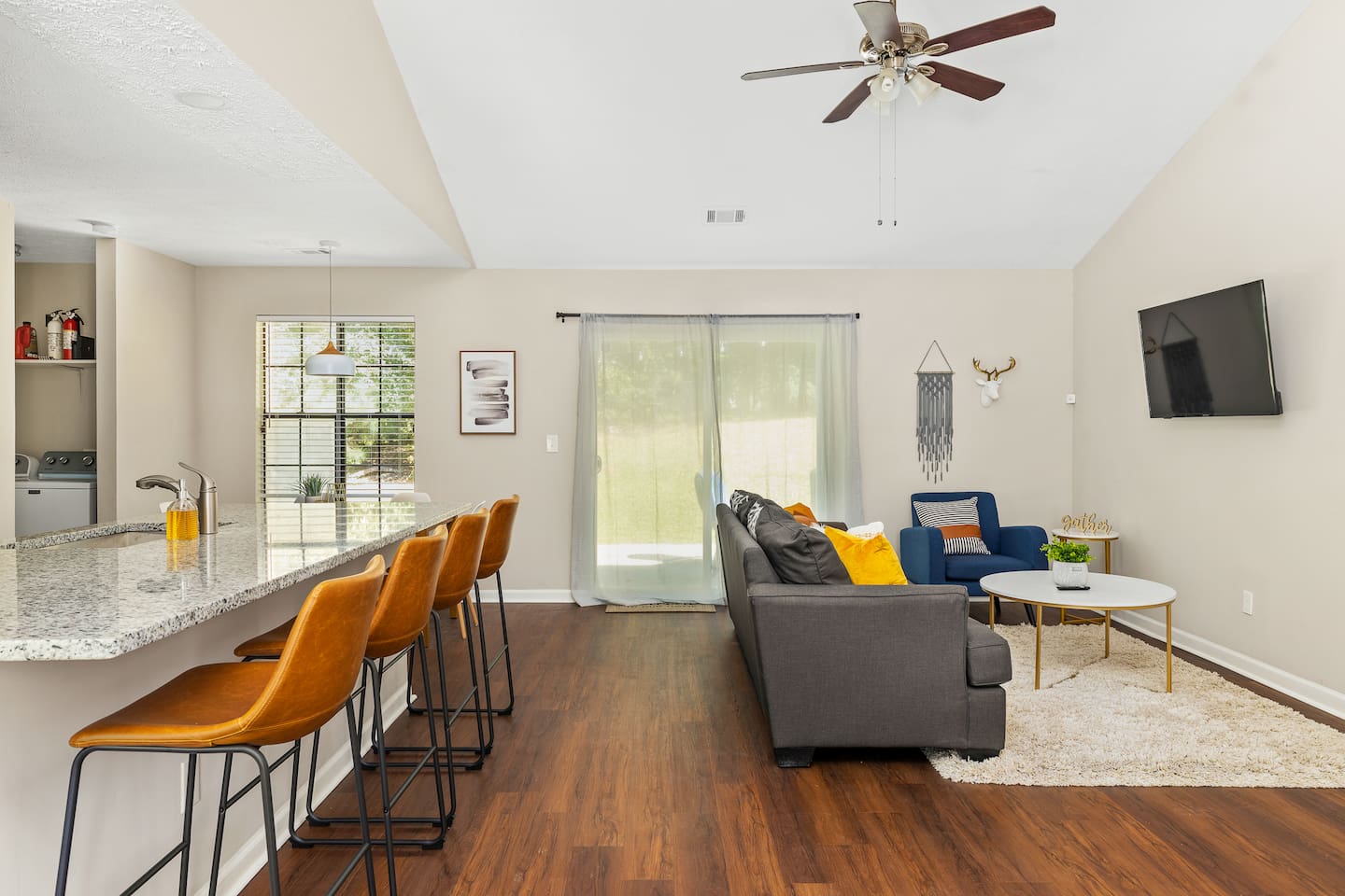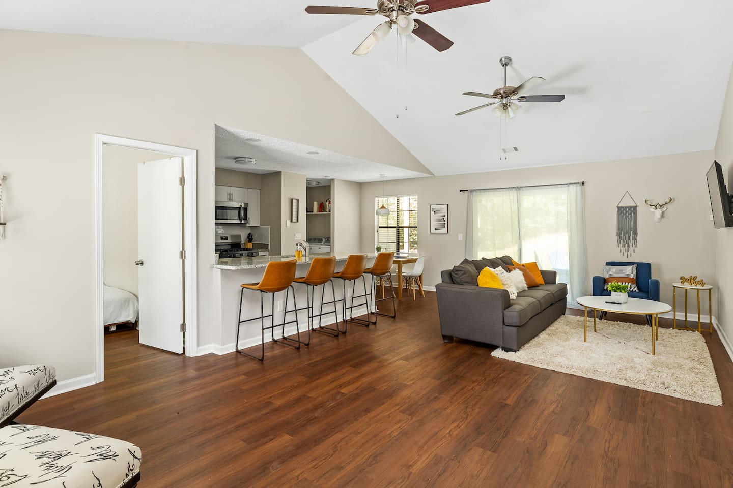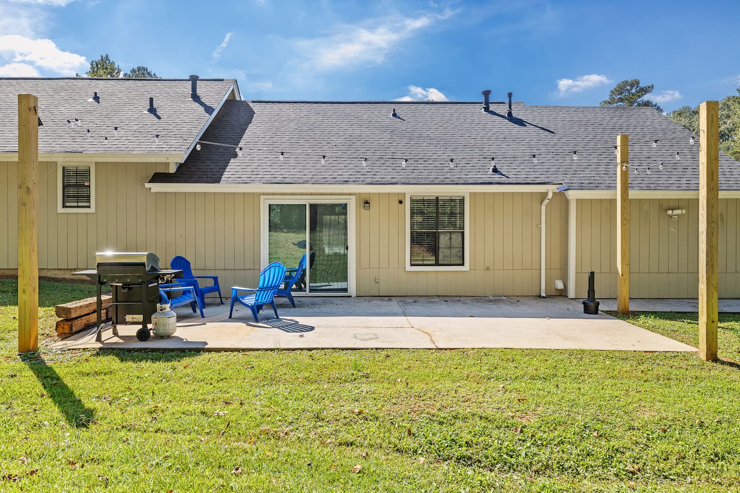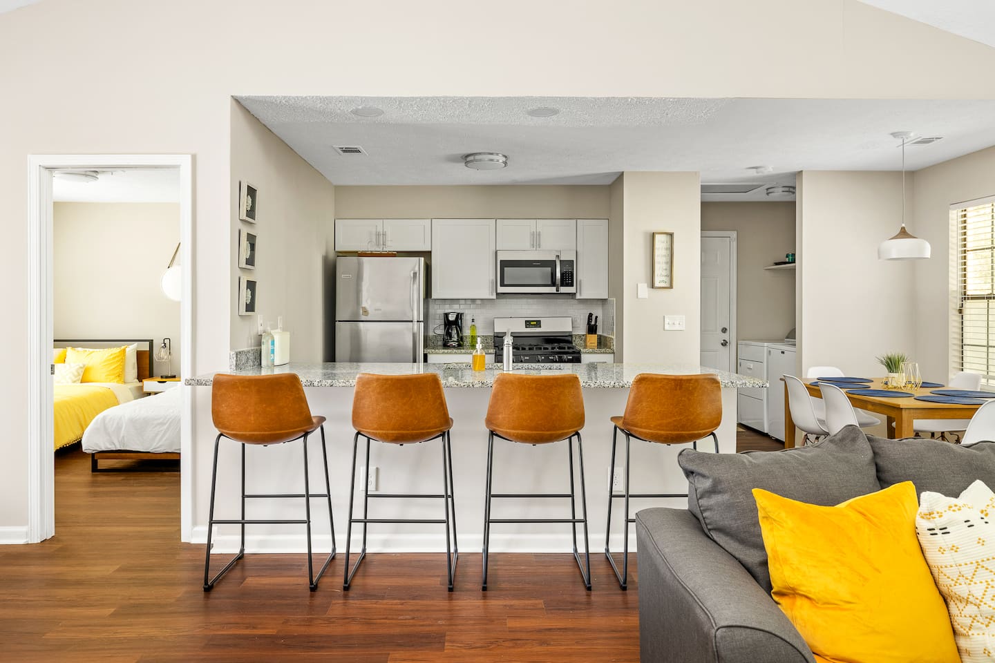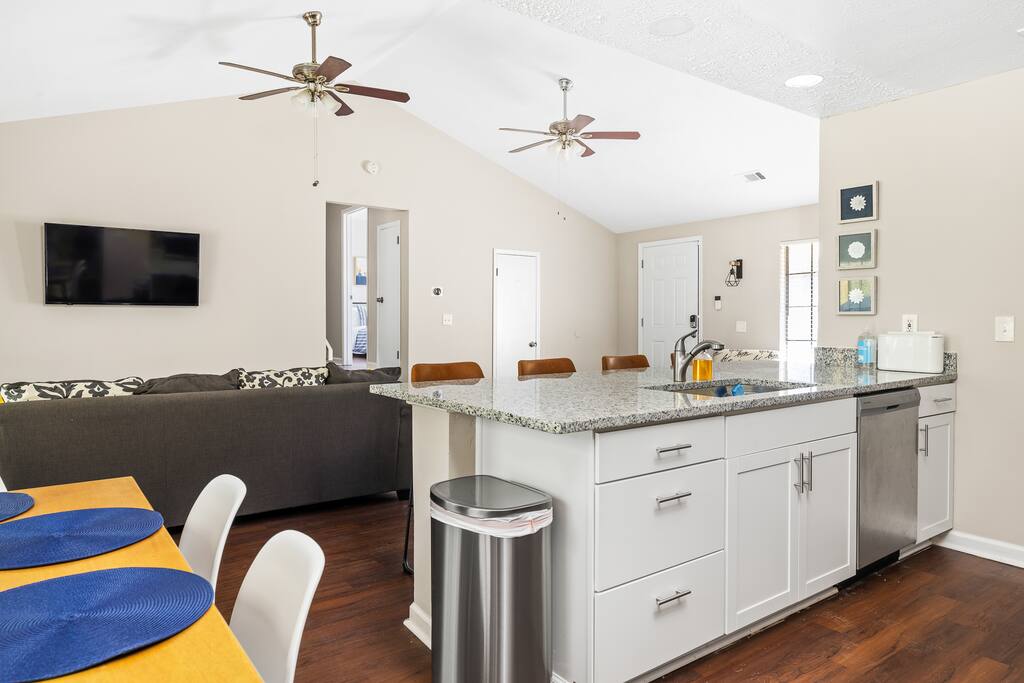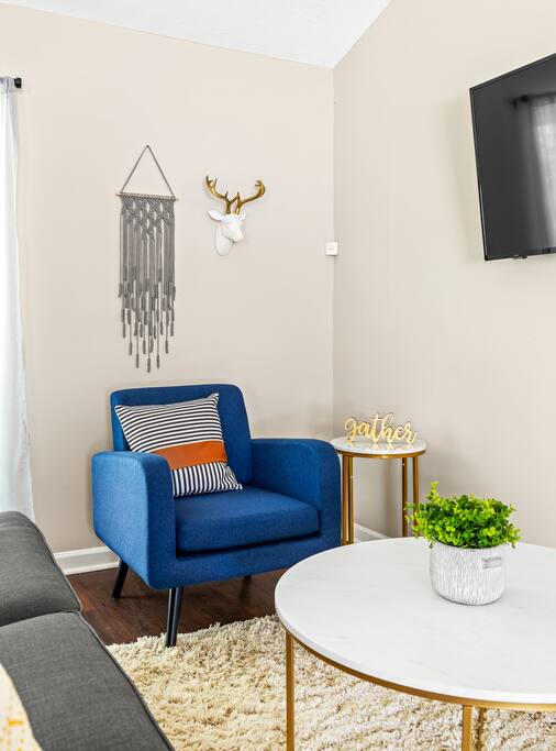 *Please note the sleeping arrangements: 1 King Bed (sleeps 2) 3 Queen Beds (sleeps 6) 1 Full Bed (sleeps 2) 1 gigantic super comfortable couch (sleeps 1) Living Space Relax on the comfortable sofa and enjoy your favorite Netflix/Disney+/HBO Max show on our 55” 4K. We have lots of seating in our open concept kitchen dining and living area so even large groups have enough seating for everyone whether you a Kitchen Channel your inner chef while cooking a meal in our newly renovated modern kitchen with brand new appliances and cookware. Pots, pans, cutlery, baking sheets, silverware, basic cooking oil, and salt & pepper provided. Drip coffee maker, tea kettle, and a toaster is also available for your convenience. We provide coffee and tea. Bedrooms Each bedroom features brand new comfortable mattresses from Zenus and each bedroom except one queen bedroom includes its own smart tv Backyard Patio Enjoy a cup of coffee in the morning or a glass of wine in the evening while hanging out on our giant patio with string lights. Very quiet oasis that works as the perfect setting for meditation, reading and yoga. Brand new 5 gas grill is great for grilling out.