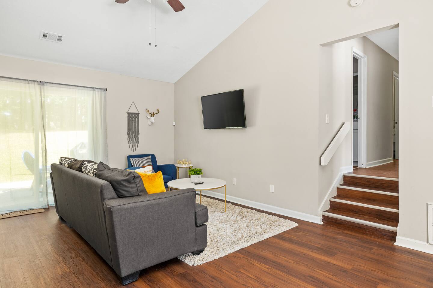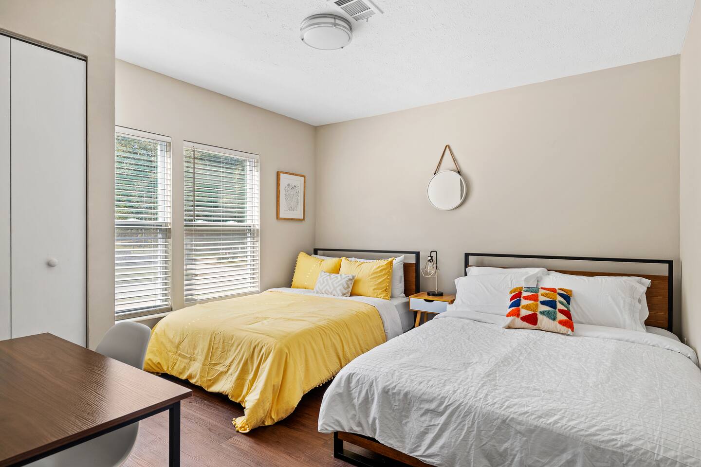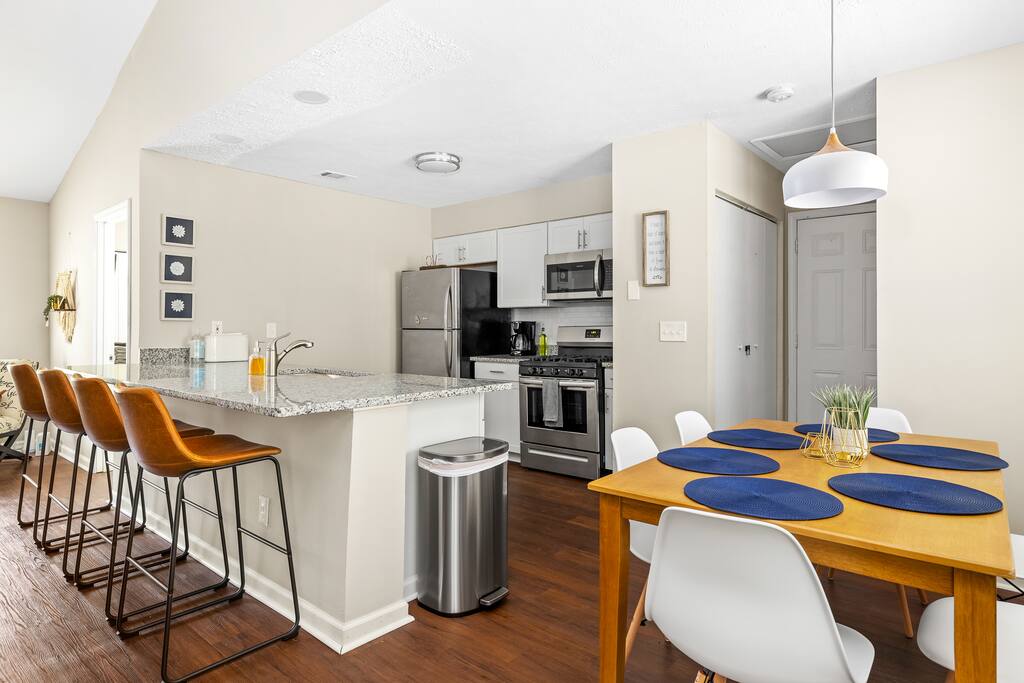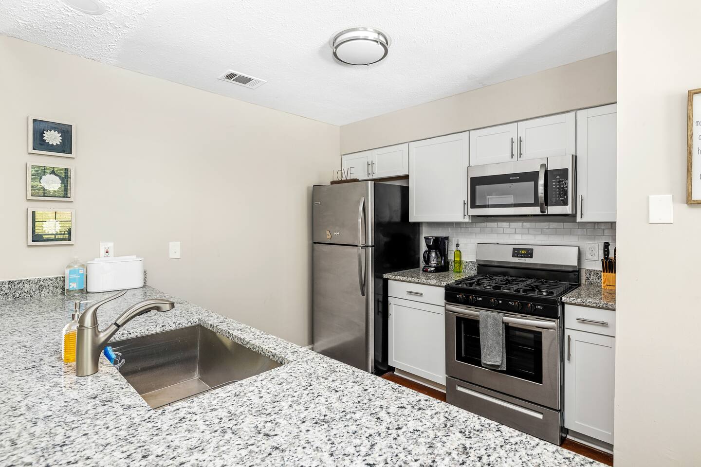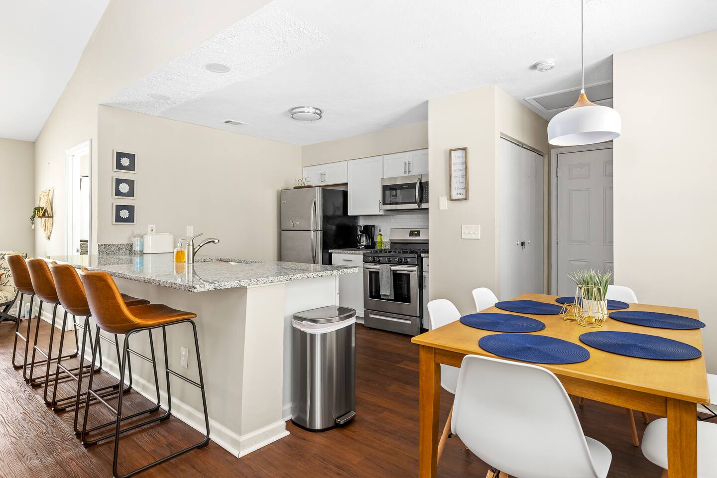 *Please note the sleeping arrangements: 1 King Bed (sleeps 2) 3 Queen Beds (sleeps 6) 1 Full Bed (sleeps 2) 1 gigantic super comfortable couch (sleeps 1) Living Space Relax on the comfortable sofa and enjoy your favorite Netflix/Disney+/HBO Max show on our 55” 4K. We have lots of seating in our open concept kitchen dining and living area so even large groups have enough seating for everyone whether you a Kitchen Channel your inner chef while cooking a meal in our newly renovated modern kitchen with brand new appliances and cookware. Pots, pans, cutlery, baking sheets, silverware, basic cooking oil, and salt & pepper provided. Drip coffee maker, tea kettle, and a toaster is also available for your convenience. We provide coffee and tea. Bedrooms Each bedroom features brand new comfortable mattresses from Zenus and each bedroom except one queen bedroom includes its own smart tv Backyard Patio Enjoy a cup of coffee in the morning or a glass of wine in the evening while hanging out on our giant patio with string lights. Very quiet oasis that works as the perfect setting for meditation, reading and yoga. Brand new 5 gas grill is great for grilling out.
