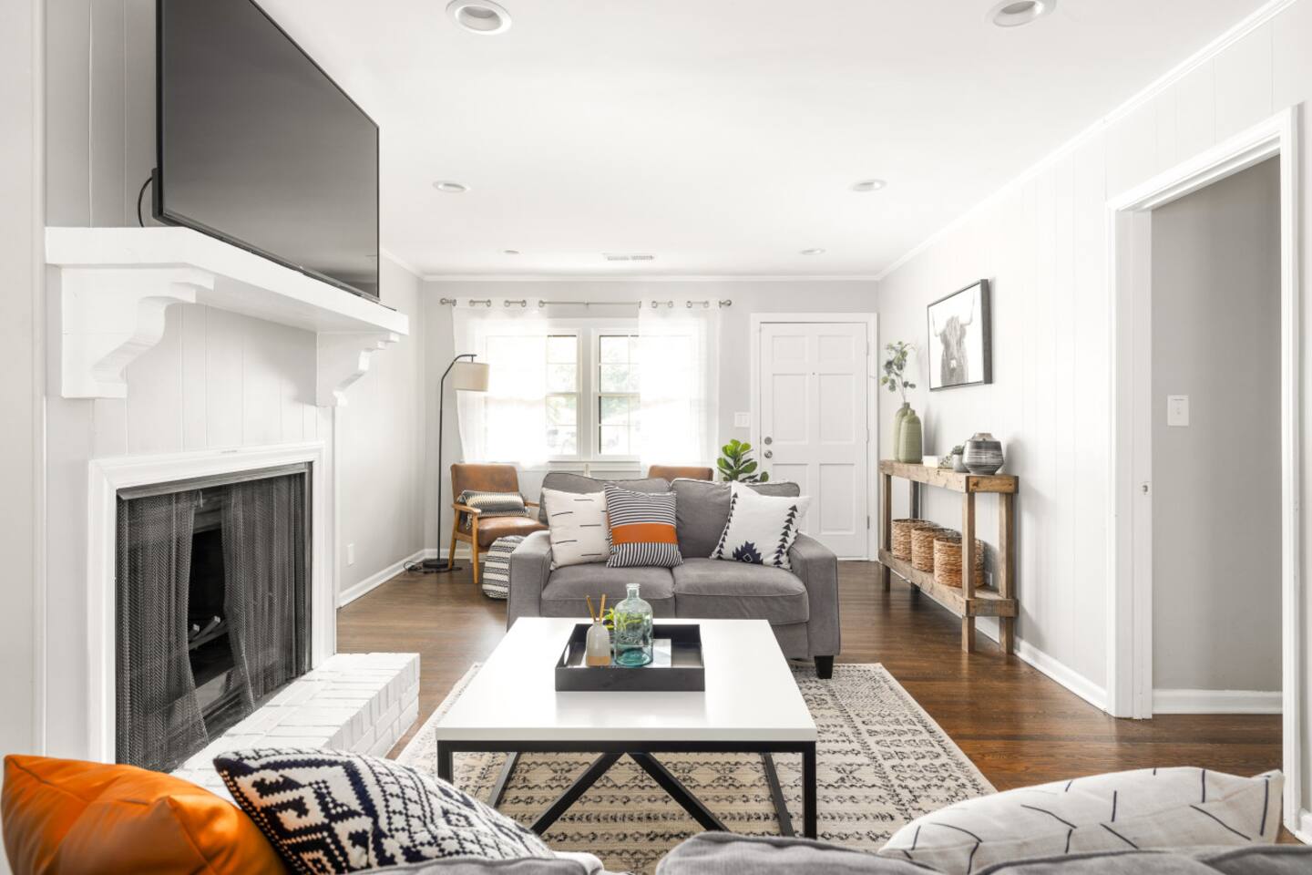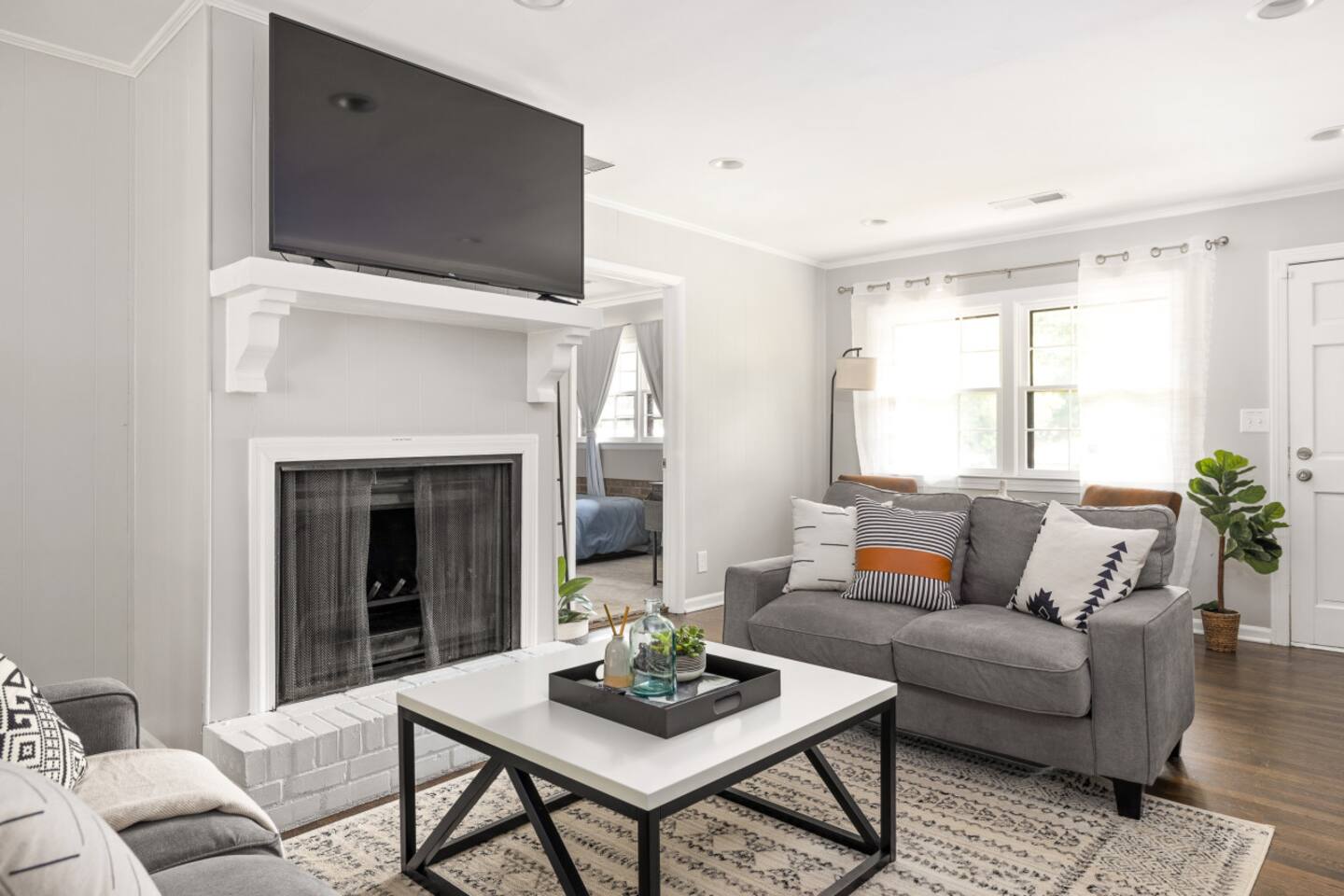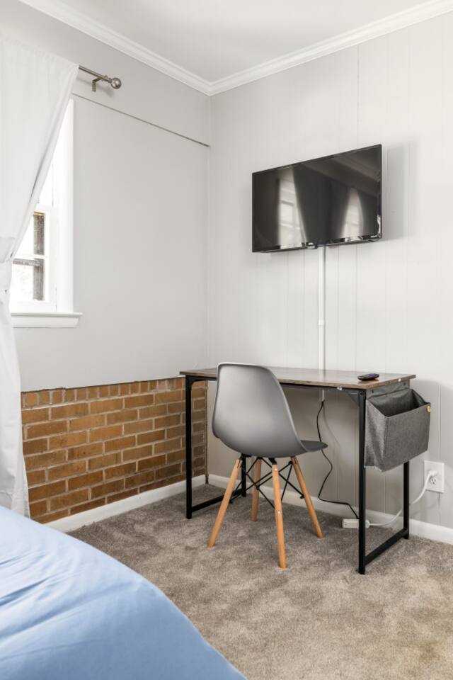 This home has 4 well designed bedrooms with super comfortable mattresses. There is also a big backyard and a large covered porch. Main Floor: The front door opens into a roomy living area that has lots of seating and a 55 inch smart TV. The dining room and kitchen are also on this level of the home. The kitchen includes lots of cooking gear and a nice array of spices & oil. A coffee maker, filters, and coffee are provided. There are enough plates, glasses, bowls, and silverware to serve 12. Bed Summary: Our home includes 4 queen beds Outdoor Space: The patio on the back of the house has lots of seating and is covered. We suggest enjoying a meal or beverage outside since the weather in Atlanta is nice most of the year. Parking: There is a driveway with 3-4parking spots. Additional cars will have no trouble finding free street parking. Our home features a total of 2 HD Smart TVs.