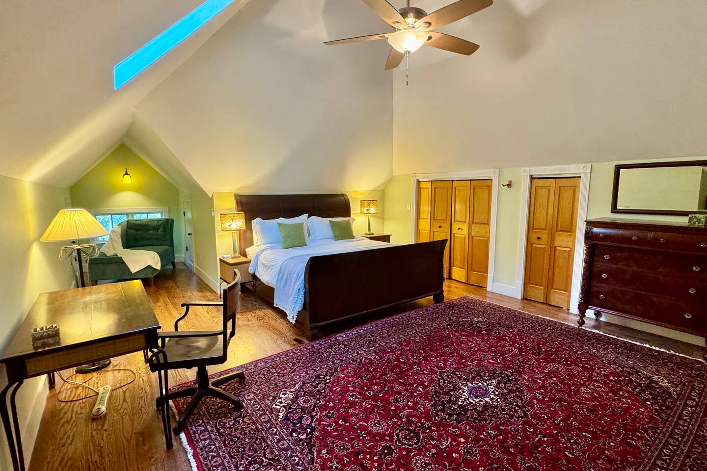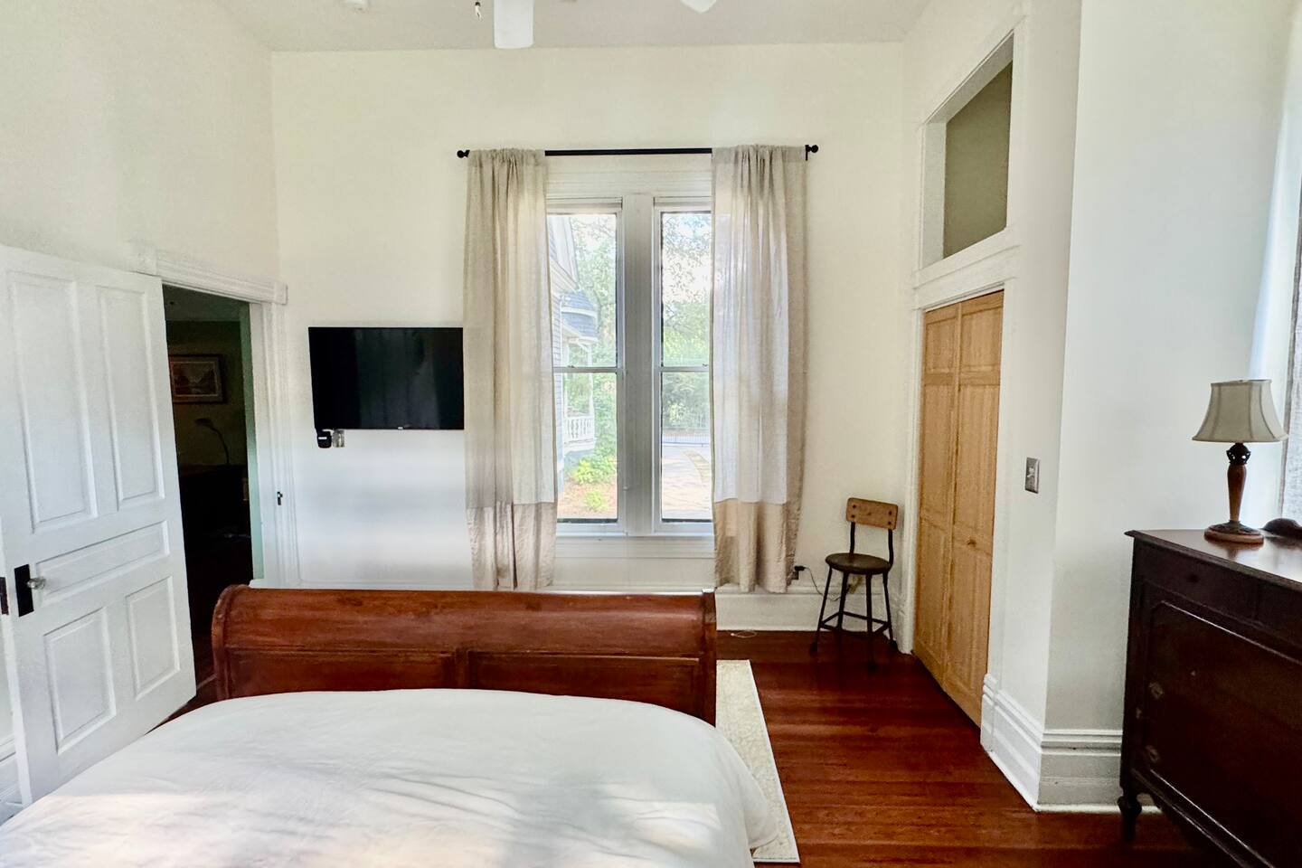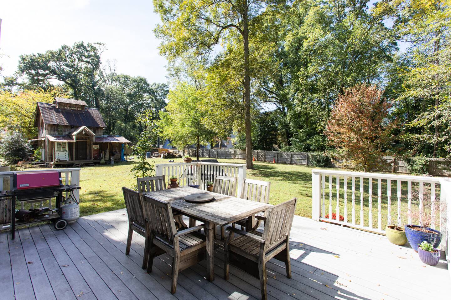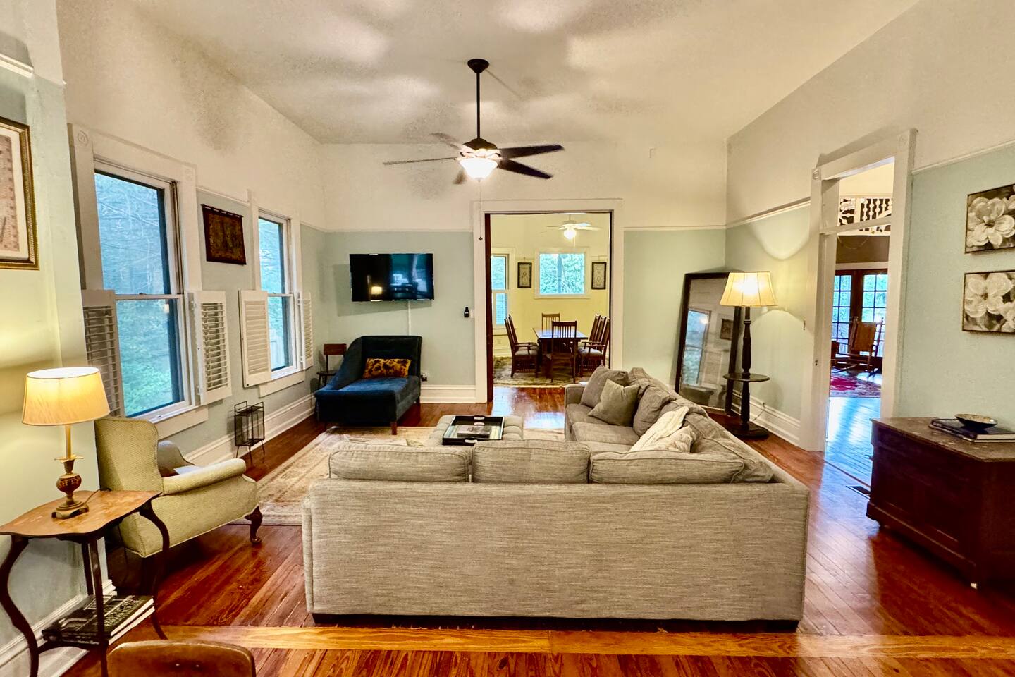 - Bedrooms & Baths: 4 bedrooms (1 king suite, 2 queens, 1 bunk room with crib), each with its own full bathroom (4 full baths total). Sleeps 8+ comfortably in beds. - Spacious Living Areas: 3 separate living spaces – a grand living room, a quiet study/office, and an airy upstairs family room – provide plenty of room to relax or work without disturbing each other. - Historic Charm & Décor: Authentic Queen Anne Victorian architecture with 12-ft ceilings and hardwood floors. Furnished with antique pieces, hundreds of books, and unique vintage touches that give the home a warm, historic character. - Gourmet Kitchen & Dining: Fully equipped chef’s kitchen with handmade cabinetry, quartz countertops, and high-end appliances (36" gas range, French-door fridge, dishwasher). Walk-in pantry with second fridge and utility sink. Formal dining room behind 10-ft pocket doors seats up to 10 for memorable group meals. - Modern Amenities: High-speed gigabit Wi-Fi and multiple Smart TVs for your streaming needs. Central heating & A/C for year-round comfort. In-unit washer and dryer for laundry. Level-2 EV charger in the detached garage to charge electric vehicles. Security system and keyless entry for peace of mind. - Outdoor Paradise: Huge 1.3-acre fenced yard with mature magnolia and fruit trees, a basketball court, and a 100+ year-old rebuilt barn adding rustic charm. Expansive wraparound front porch and back patio with seating – perfect for morning coffee or evening cocktails while enjoying the garden views. - Prime Location: Located in walkable Kirkwood, a historic Atlanta neighborhood. Steps from the Kirkwood Urban Forest Preserve (nature trails and community garden) and direct access to the PATH trail connecting to Atlanta’s BeltLine. Walk to Kirkwood Village restaurants, cafes, and Pullman Yards arts district. Short drive or bike to Little Five Points, Decatur, and other intown neighborhoods. Easy access to MARTA transit and major roads, yet tucked on a quiet street with no through-traffic. - Ideal For Groups: Perfect for families (kids’ bunk room, playset, toys, and crib provided), remote work (multiple workspaces and fast internet), or creative projects like film shoots and corporate retreats (ample space and unique backdrops). An optional 1BR/1BA carriage house apartment above the garage can be rented additionally for larger groups or added privacy.