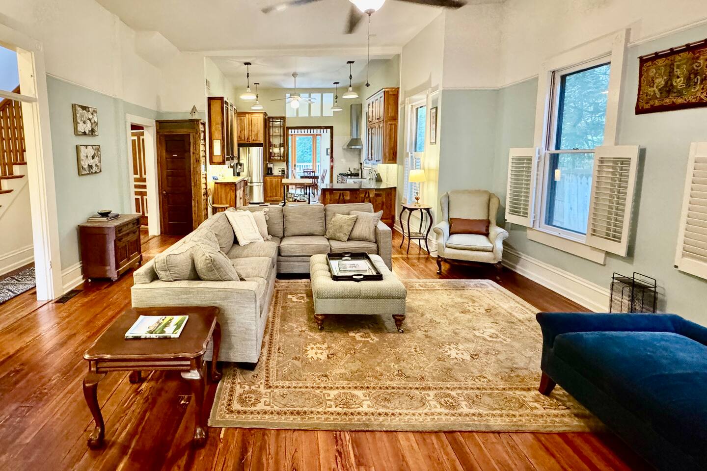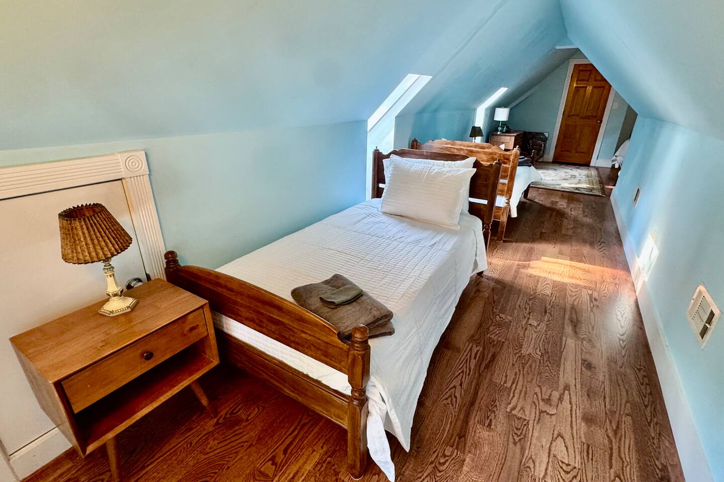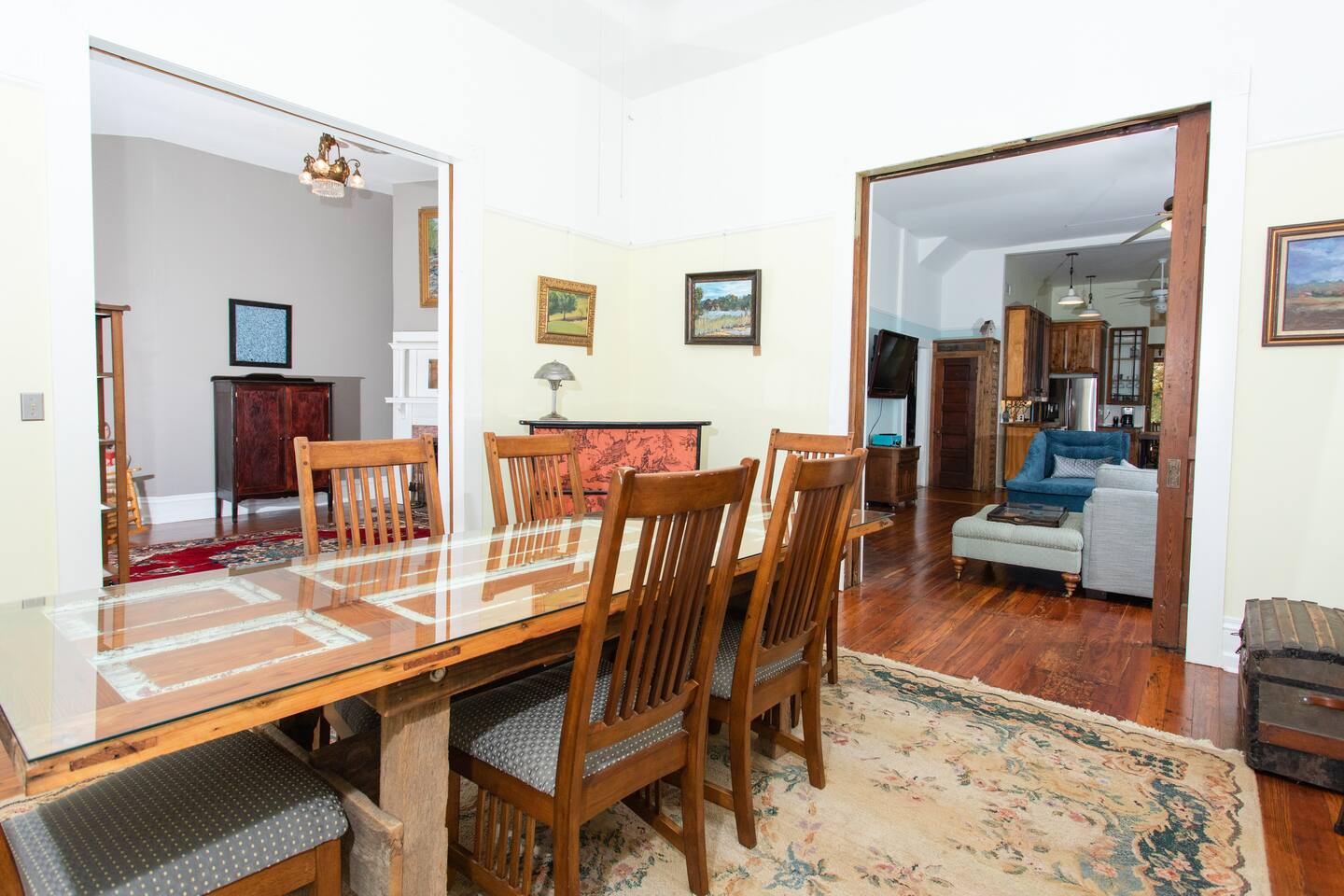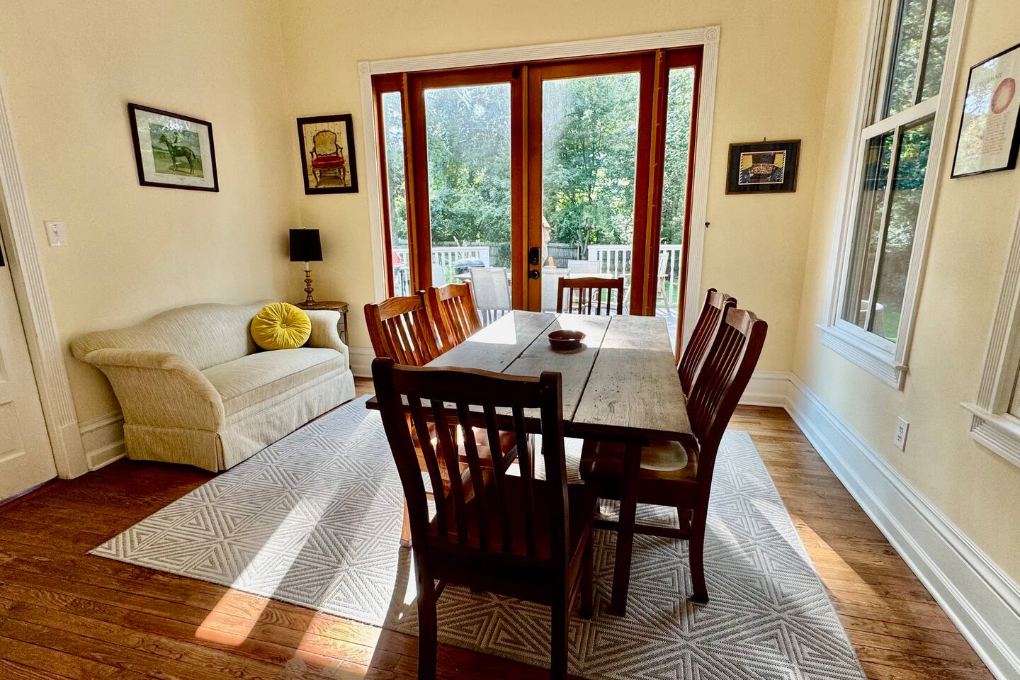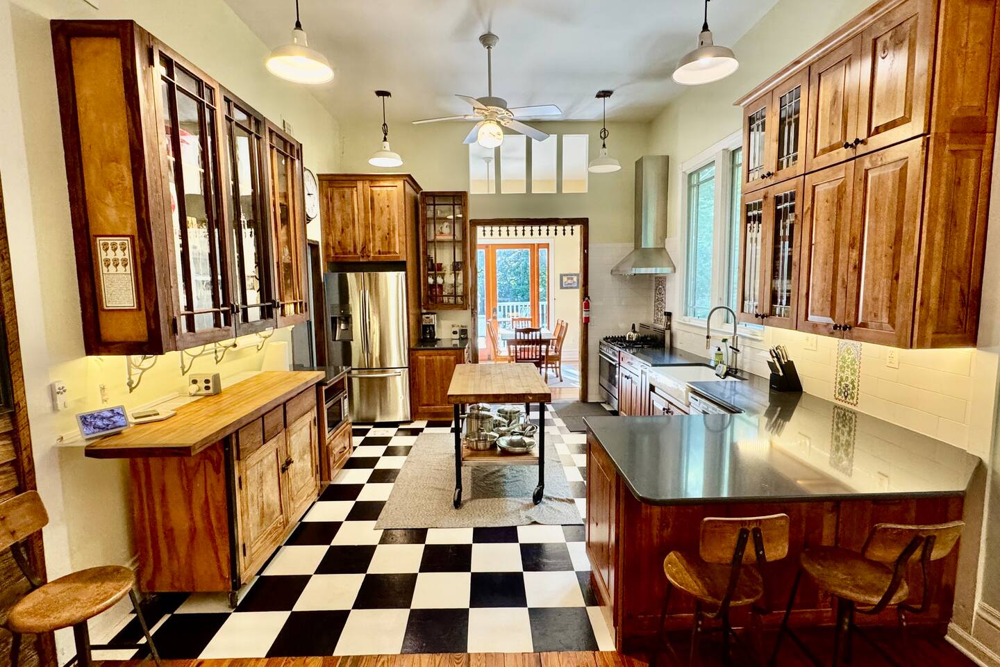 - Bedrooms & Baths: 4 bedrooms (1 king suite, 2 queens, 1 bunk room with crib), each with its own full bathroom (4 full baths total). Sleeps 8+ comfortably in beds. - Spacious Living Areas: 3 separate living spaces – a grand living room, a quiet study/office, and an airy upstairs family room – provide plenty of room to relax or work without disturbing each other. - Historic Charm & Décor: Authentic Queen Anne Victorian architecture with 12-ft ceilings and hardwood floors. Furnished with antique pieces, hundreds of books, and unique vintage touches that give the home a warm, historic character. - Gourmet Kitchen & Dining: Fully equipped chef’s kitchen with handmade cabinetry, quartz countertops, and high-end appliances (36" gas range, French-door fridge, dishwasher). Walk-in pantry with second fridge and utility sink. Formal dining room behind 10-ft pocket doors seats up to 10 for memorable group meals. - Modern Amenities: High-speed gigabit Wi-Fi and multiple Smart TVs for your streaming needs. Central heating & A/C for year-round comfort. In-unit washer and dryer for laundry. Level-2 EV charger in the detached garage to charge electric vehicles. Security system and keyless entry for peace of mind. - Outdoor Paradise: Huge 1.3-acre fenced yard with mature magnolia and fruit trees, a basketball court, and a 100+ year-old rebuilt barn adding rustic charm. Expansive wraparound front porch and back patio with seating – perfect for morning coffee or evening cocktails while enjoying the garden views. - Prime Location: Located in walkable Kirkwood, a historic Atlanta neighborhood. Steps from the Kirkwood Urban Forest Preserve (nature trails and community garden) and direct access to the PATH trail connecting to Atlanta’s BeltLine. Walk to Kirkwood Village restaurants, cafes, and Pullman Yards arts district. Short drive or bike to Little Five Points, Decatur, and other intown neighborhoods. Easy access to MARTA transit and major roads, yet tucked on a quiet street with no through-traffic. - Ideal For Groups: Perfect for families (kids’ bunk room, playset, toys, and crib provided), remote work (multiple workspaces and fast internet), or creative projects like film shoots and corporate retreats (ample space and unique backdrops). An optional 1BR/1BA carriage house apartment above the garage can be rented additionally for larger groups or added privacy.