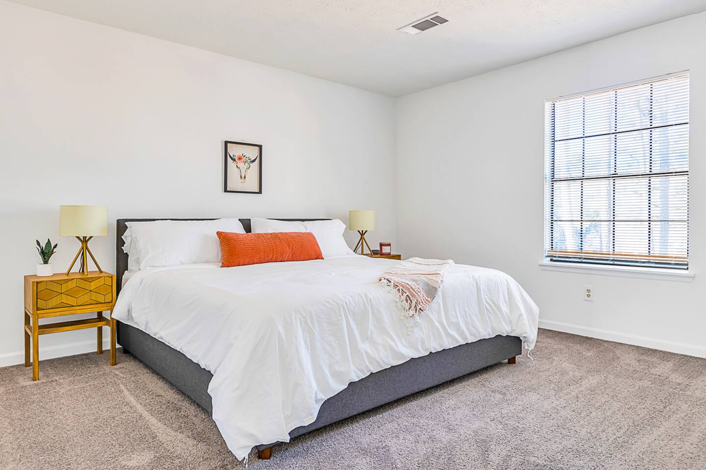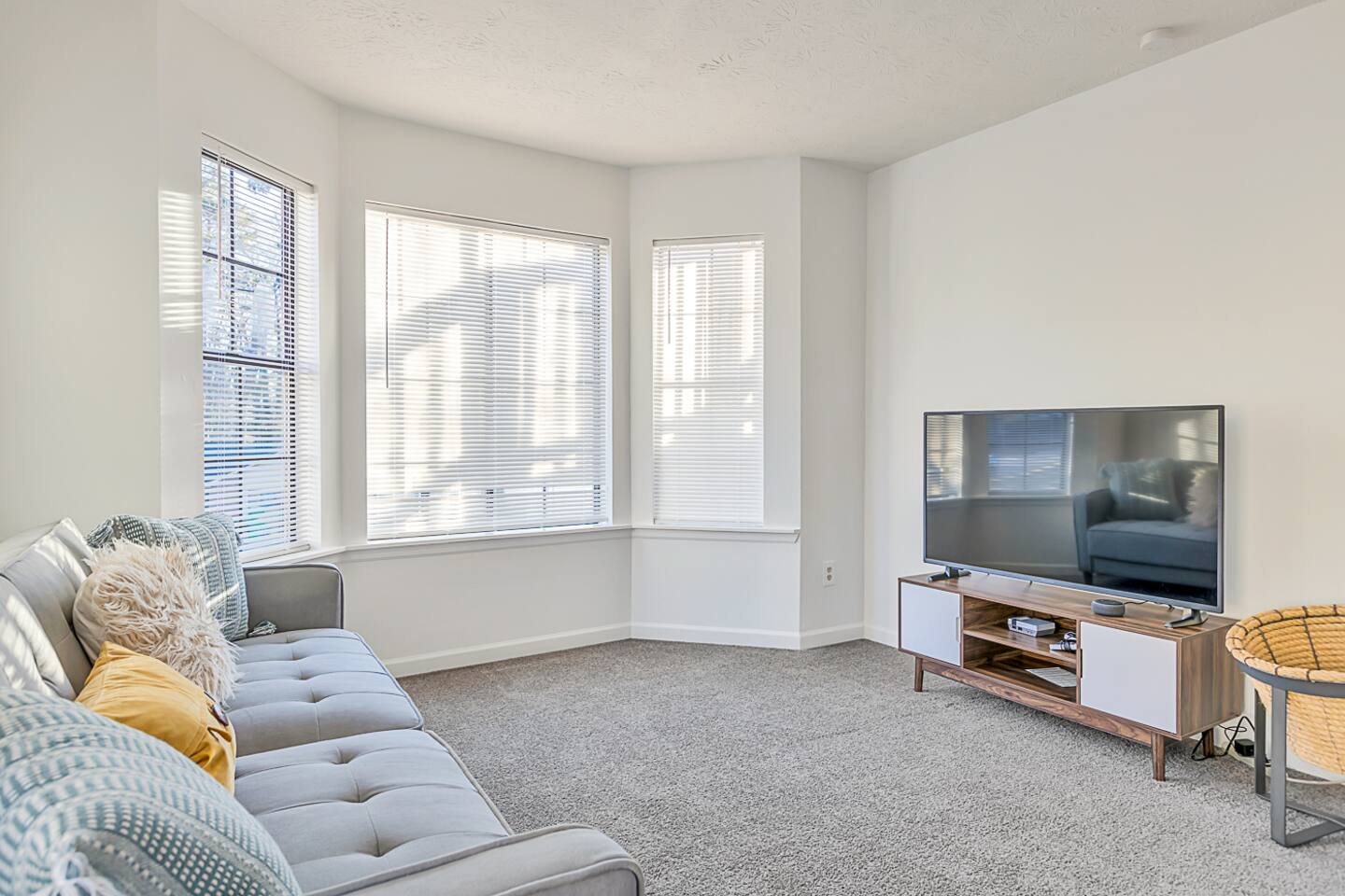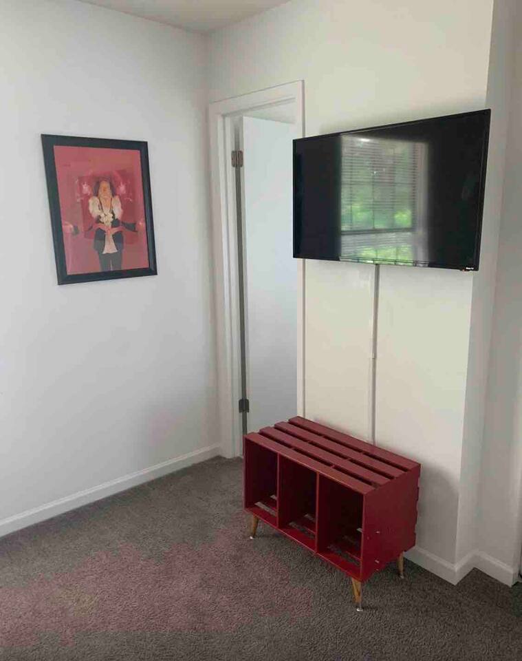 As you enter through the front door, you'll find yourself in a bright and welcoming open concept living/kitchen/dining area that's perfect for hanging out with family and friends. The living room features plenty of comfortable seating and a large 55 inch smart TV with Roku, giving you access to all your favorite streaming services. The fully equipped kitchen is stocked with cooking gear, spices, and oil, and includes a coffee maker with filters and coffee provided. With enough plates, glasses, bowls, and silverware to serve 12, you'll have everything you need to enjoy meals together. The dining room has seating for 6, and the kitchen bar has seating for 4. The main level of the home features 4 bedrooms and 3 bathrooms, with a king bed, 3 queen beds, a bunk bed, and a sofa bed to accommodate up to 12 guests comfortably. Each bedroom is beautifully decorated and includes all the amenities you need for a good night's rest, including a TV in each bedroom. Step outside to our huge backyard and you'll find plenty of outdoor seating and a gas grill, perfect for enjoying meals or drinks al fresco. With a driveway that accommodates up to 6 cars and plenty of free street parking, parking is never a problem.