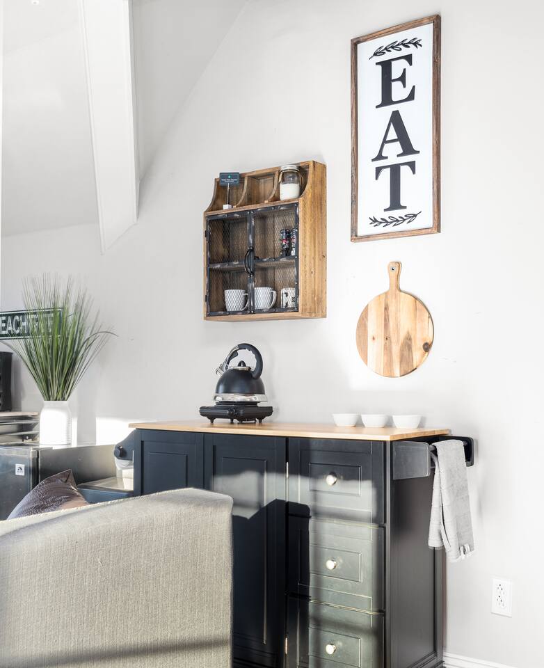 Experience luxury living in this fully equipped carriage house featuring air conditioning, a full bathroom, spacious living room, and a convenient kitchenette. Relax and unwind in the comfort of a queen-size bed while enjoying your favorite shows on the 32 inch TV. Indulge in the ultimate level of comfort and style during your stay